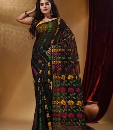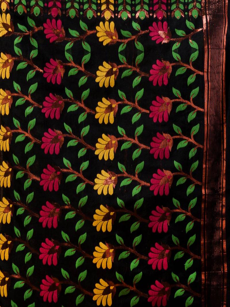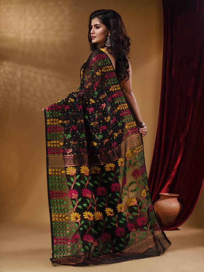 Black cotton handwoven jamdani saree with floral designs and motifs