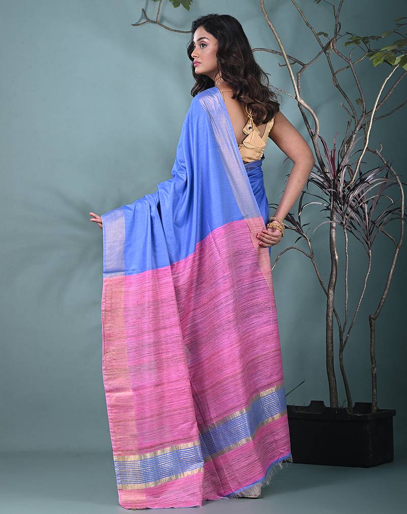 Blue viscose saree with gheecha pallu and golden border