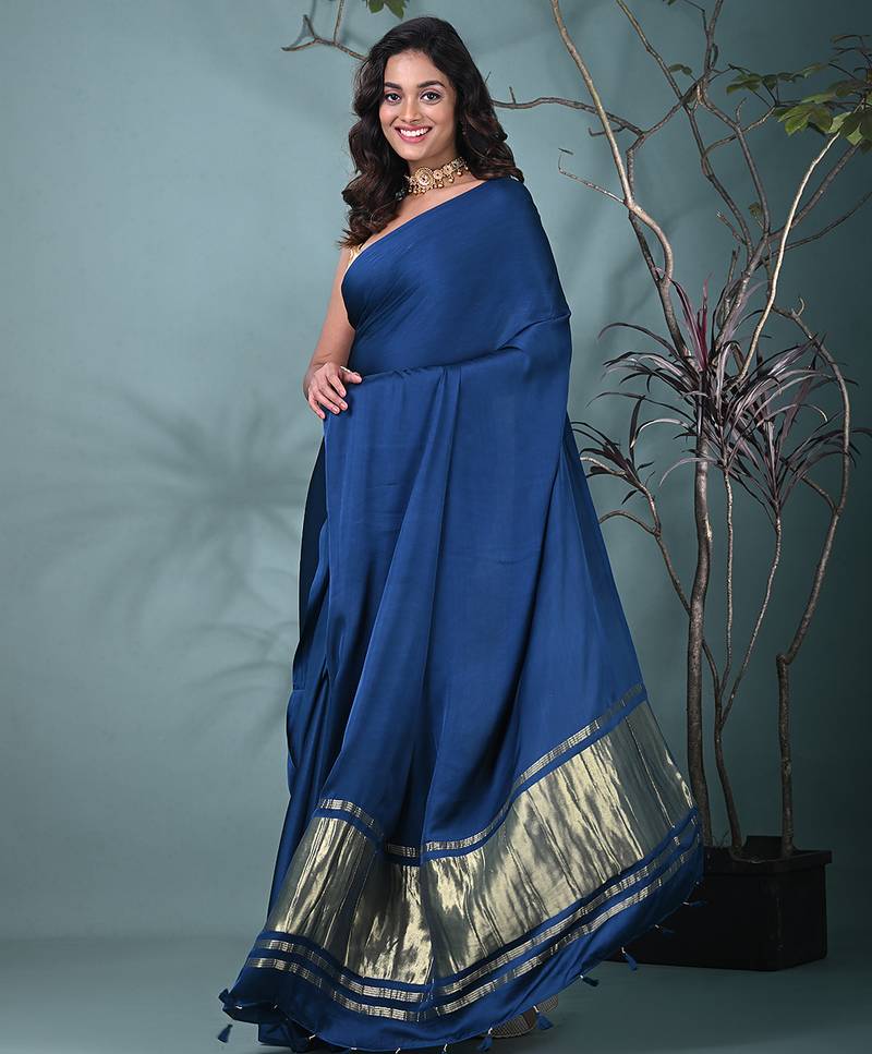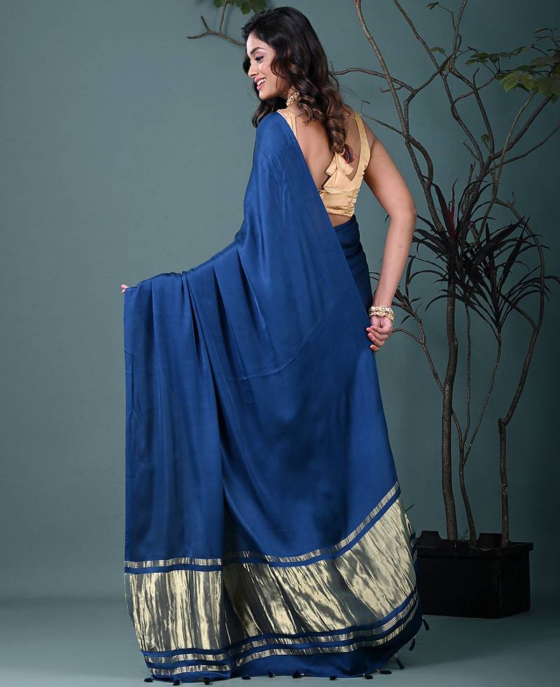 | Product Name | Cobalt Blue Modal Silk Blend Saree With Golden Border And Tassels | |