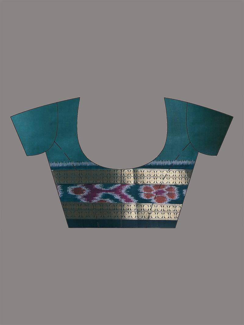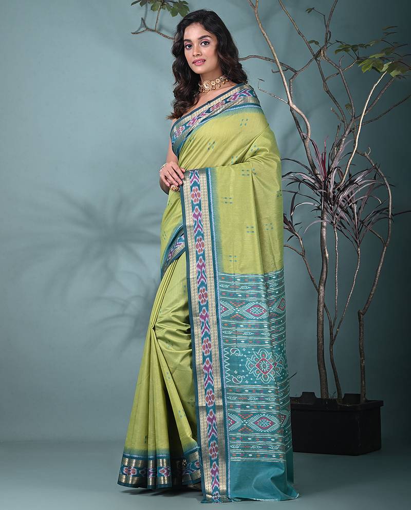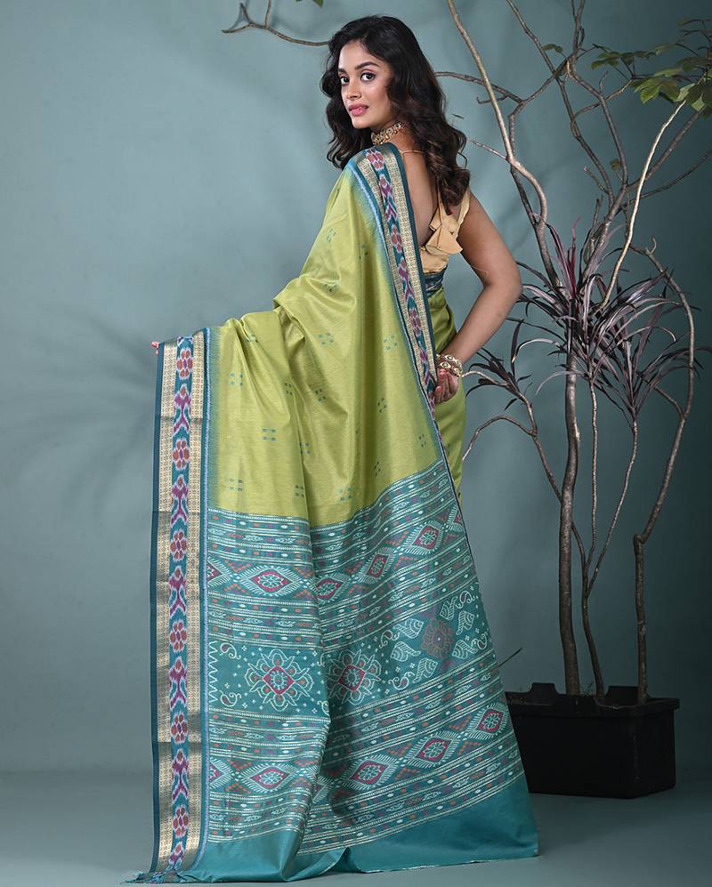 Elegant green tussar silk blend saree with sambhal puri ikat border