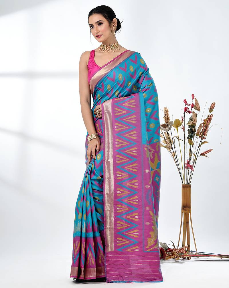 Exquisite sky blue pochampally silk blend saree with vibrant ikat pattern