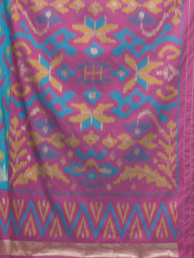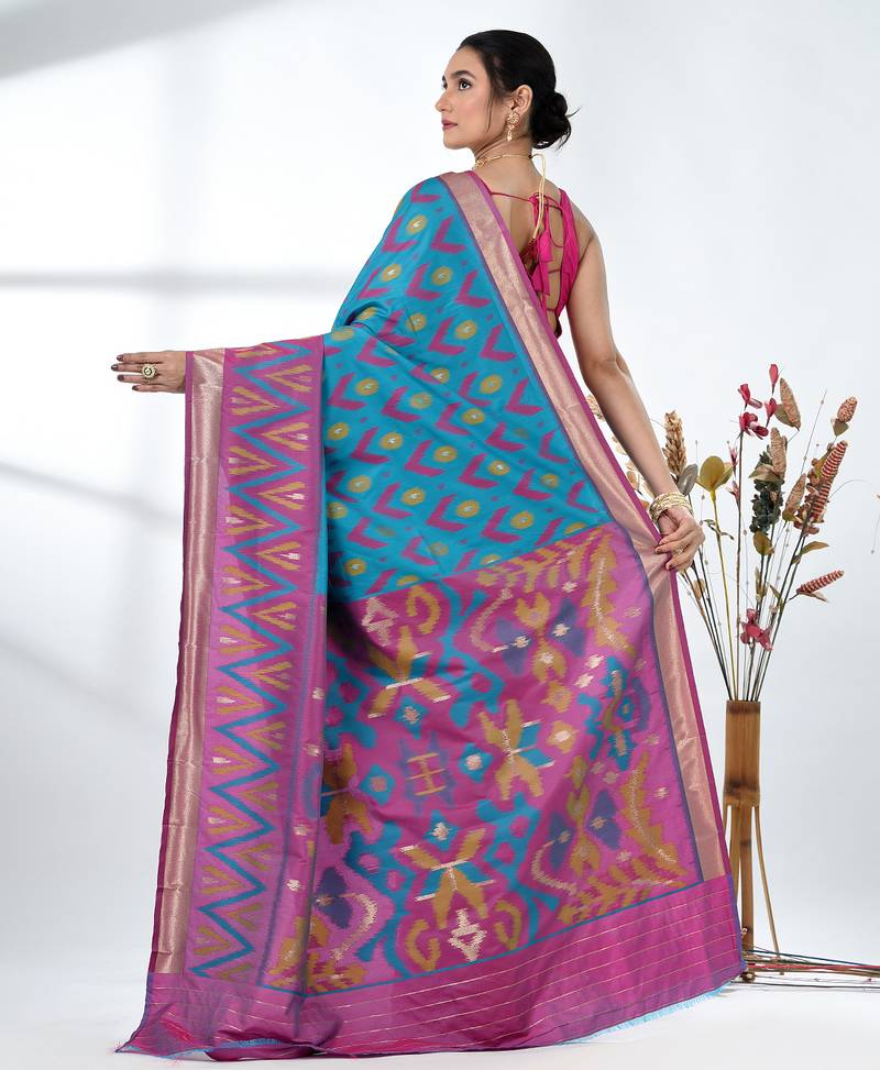 | Product Description | Celebrate Tradition With A Touch Of Elegance In This Stunning Pochampally Silk Saree. The Rich Sky Blue Hue Forms A Beautiful Backdrop For The Intricate And Colorful Ikat Patterns, Weaving A Tale Of Craftsmanship And Heritage. The Saree Features Bold Geometric Motifs In Different Shades Of Colors, Creating A Modern Yet Timeless Appeal. Crafted From Premium Pochampally Silk, This Saree Offers A Luxurious Drape, Perfect For Weddings, Festive Occasions, Or Special Celebrations. The Golden Zari Border Adds A Regal Touch, Enhancing Its Overall Charm. Pair It With Matching Jewelry And A Statement Blouse To Complete Your Festive Look. |