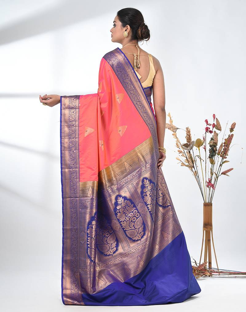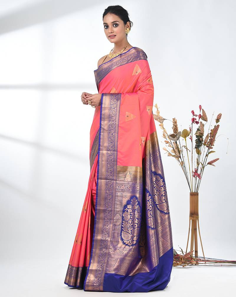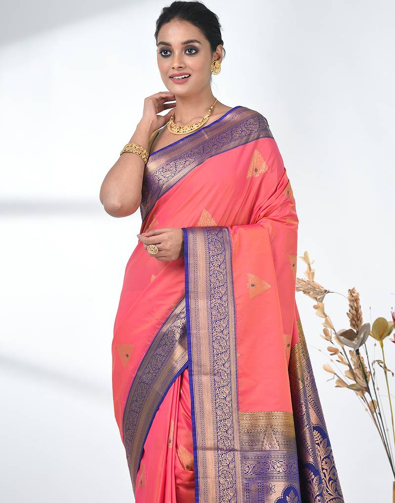 Embrace Timeless Elegance With This Exquisite Pink Pure South Silk Saree. The Luxurious Fabric Offers A Soft And Radiant Drape, Enhancing The Grace Of The Wearer. The Saree Features Intricate Zari Work Throughout, With A Stunning Contrast Of Blue At The Border, Adding A Regal Touch. The Rich Golden Zari Motifs And Detailed Floral Designs In The Border Further Elevate Its Beauty, Making It The Perfect Choice For Weddings, Festivals, And Special Occasions. The Fine Quality South Silk Fabric Ensures Comfort And Sophistication, While The Bold Color Combination Creates A Striking And Elegant Look. Pair It With Traditional Jewelry And A Sleek Blouse To Complete Your Festive Look.