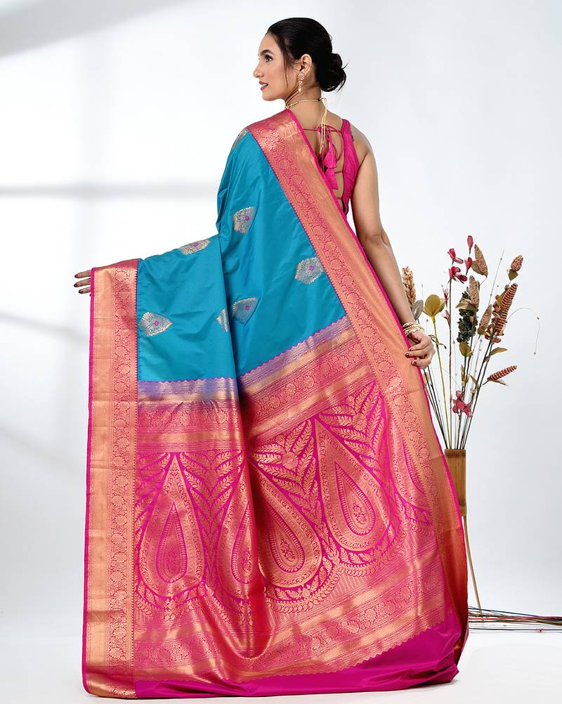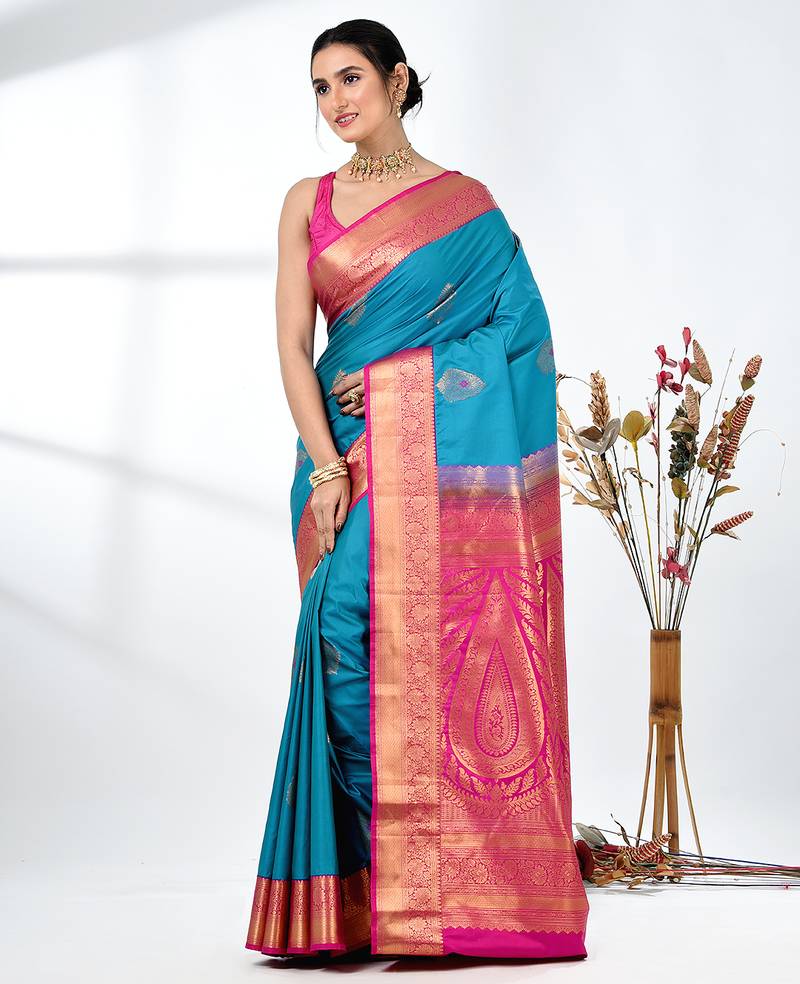 | Product Description | Embrace Timeless Elegance With This Exquisite Sky Blue Pure South Silk Saree. The Luxurious Fabric Offers A Soft And Radiant Drape, Enhancing The Grace Of The Wearer. The Saree Features Intricate Zari Work Throughout, With A Stunning Contrast Of Pink At The Border, Adding A Regal Touch. The Rich Golden Zari Motifs And Detailed Floral Designs In The Border Further Elevate Its Beauty, Making It The Perfect Choice For Weddings, Festivals, And Special Occasions. The Fine Quality South Silk Fabric Ensures Comfort And Sophistication, While The Bold Color Combination Creates A Striking And Elegant Look. Pair It With Traditional Jewelry And A Sleek Blouse To Complete Your Festive Look. |