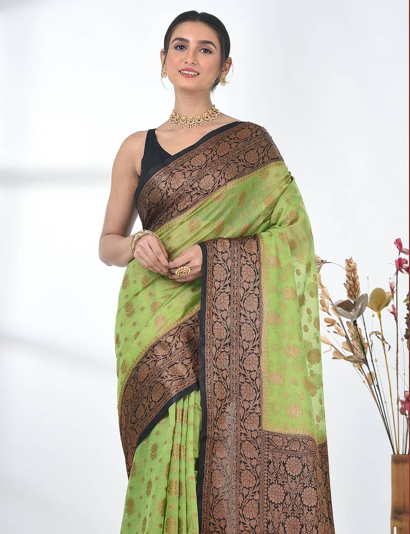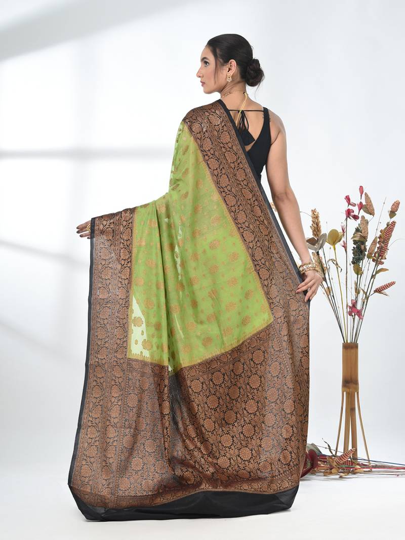 | Product Description | This Stunning Green Georgette Saree Exudes Elegance With Its Intricate Floral Motifs And Rich Black And Gold Border. The Luxurious Georgette Fabric Drapes Beautifully, Offering Both Comfort And Style. Ideal For Weddings, Parties, Or Any Festive Occasion, This Saree Blends Tradition With Modern Flair. The Combination Of Bold Black With The Vibrant Red And Gold Makes It A Standout Piece For Any Special Event. Pair It With A Red Blouse And Statement Jewelry For A Complete Look. |