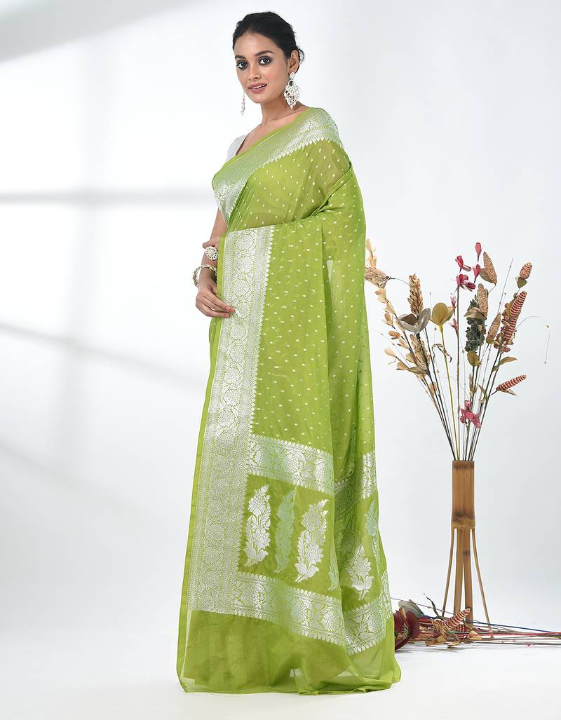Green georgette saree with silver border and detailing