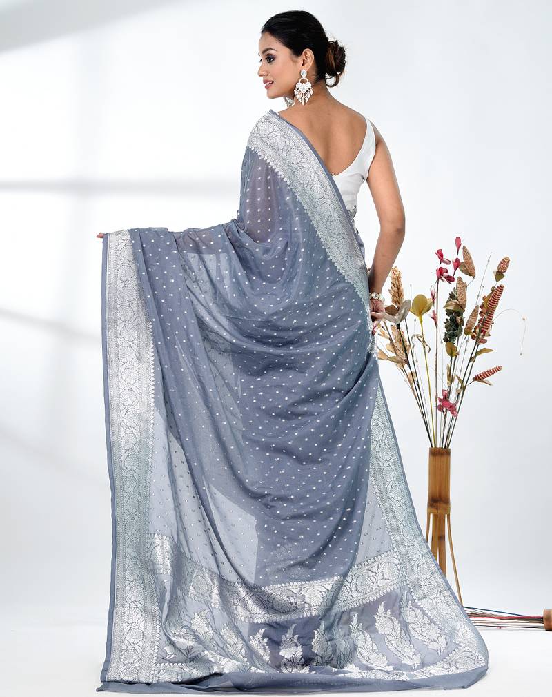 Grey georgette saree with silver border and detailing