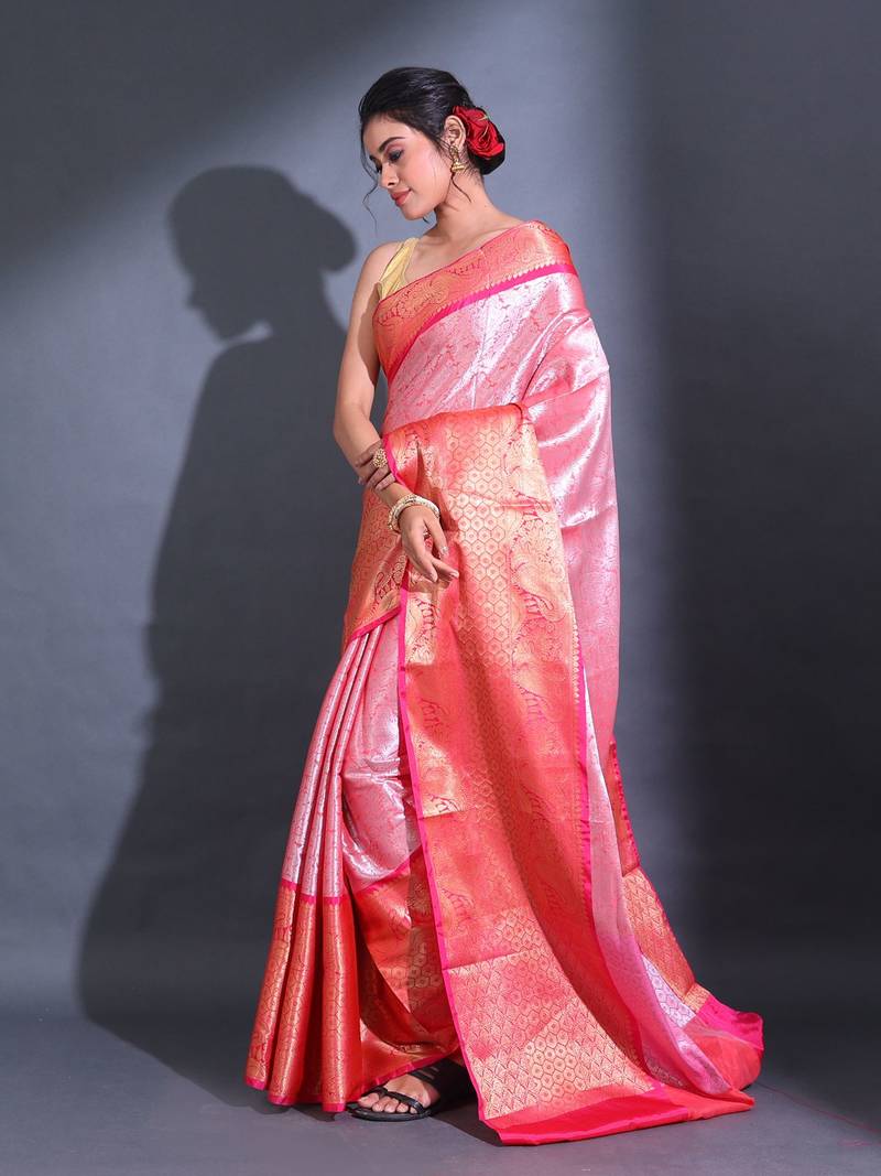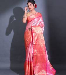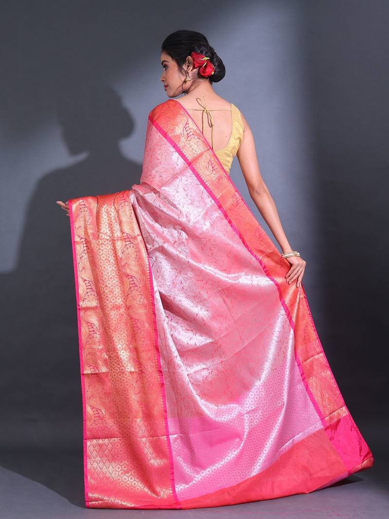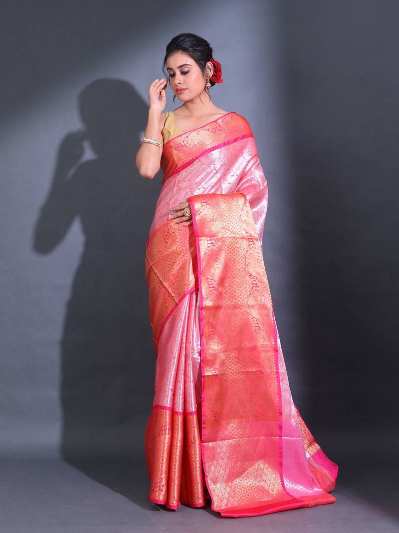 Pink handwoven kanjivaram pattu saree with paisley and ethnic designs