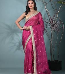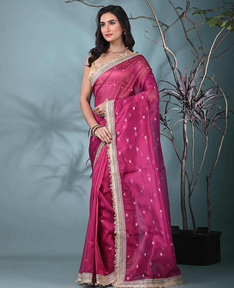 | Product Description | Elevate Your Festive Wardrobe With This Stunning Pink Tissue Saree, Designed To Captivate Attention At Any Special Occasion. Crafted From Premium Tissue Fabric, This Saree Offers A Graceful Sheen And Lightweight Feel, Perfect For Celebrations. The Intricate Gotapatti Work Along The Borders Adds A Touch Of Traditional Elegance, Making It A Standout Piece For Weddings, Parties, And Cultural Events. The Saree Is Designed With Timeless Appeal, Featuring Delicate Motifs Throughout The Fabric That Enhance Its Charm. The Contrasting Golden Hued Border With Gotapatti Embroidery Brings A Sophisticated Richness To The Overall Look. Pair It With A Chic Blouse And Statement Accessories For A Complete Ensemble That Blends Modern Flair With Classic Artistry. |