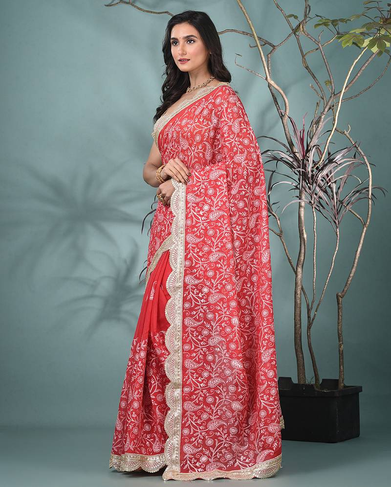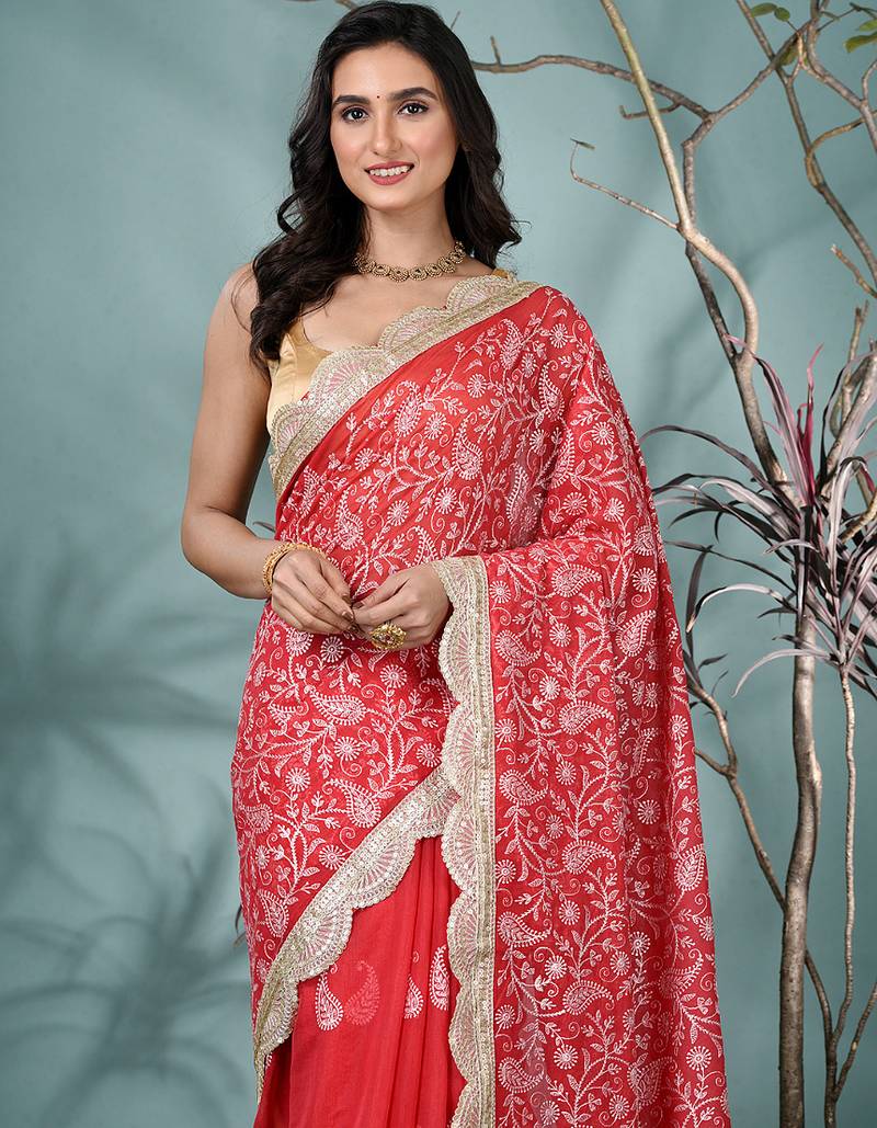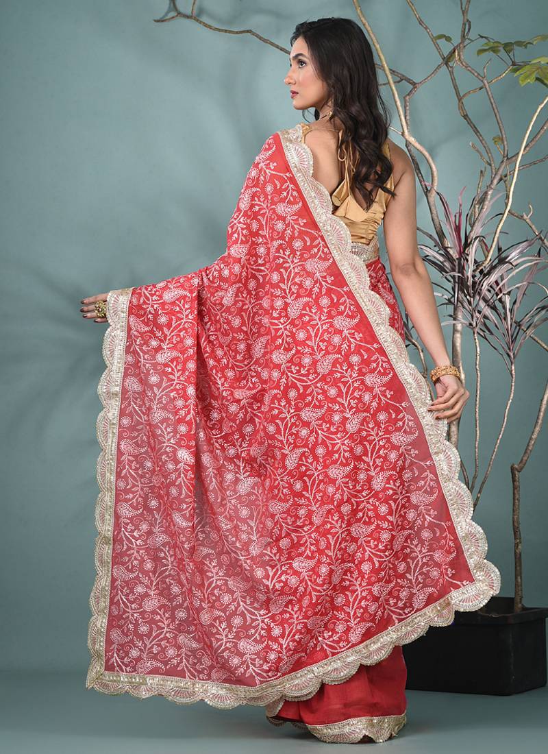| Product Description | This Exquisite Red Chanderi Silk Saree Features Delicate Floral Embroidery That Adds A Touch Of Traditional Charm. The Intricate Embroidery Is Beautifully Complemented By The Shimmering Texture Of The Chanderi Fabric, Making It Perfect For Weddings, Festivals, Or Any Grand Celebration. The Saree Is Further Enhanced With A Scalloped Border, Adding A Graceful And Elegant Finish. Pair It With Your Favorite Blouse To Create A Stunning Ensemble For Any Special Occasion. |