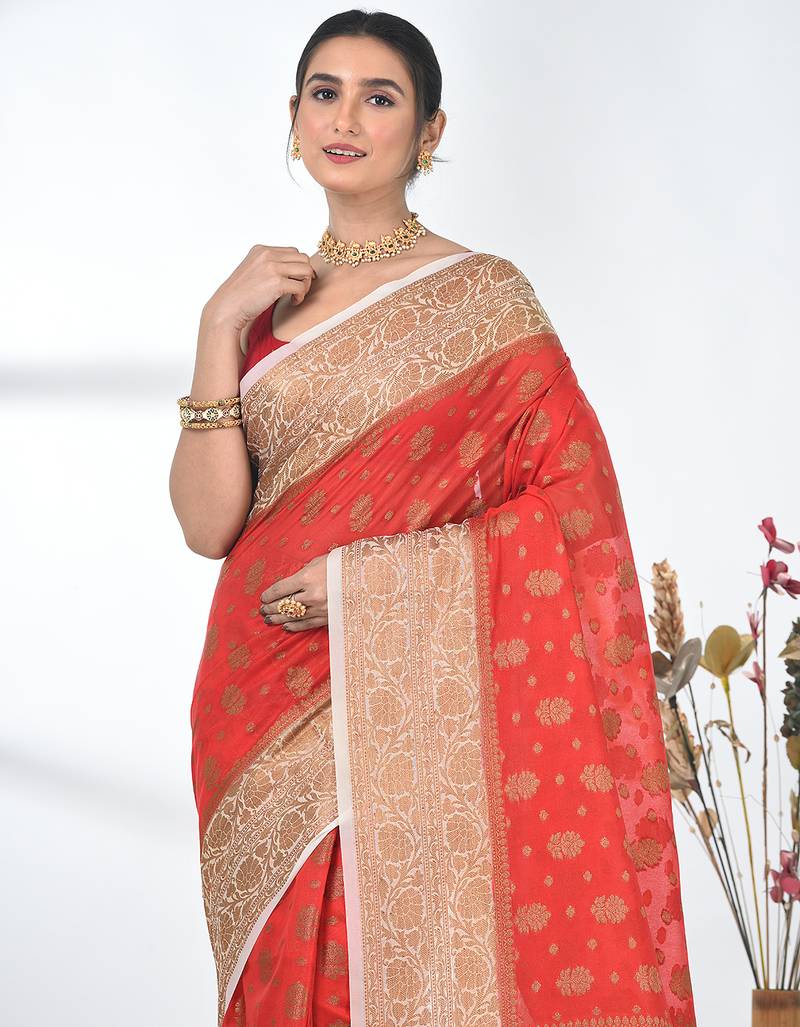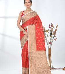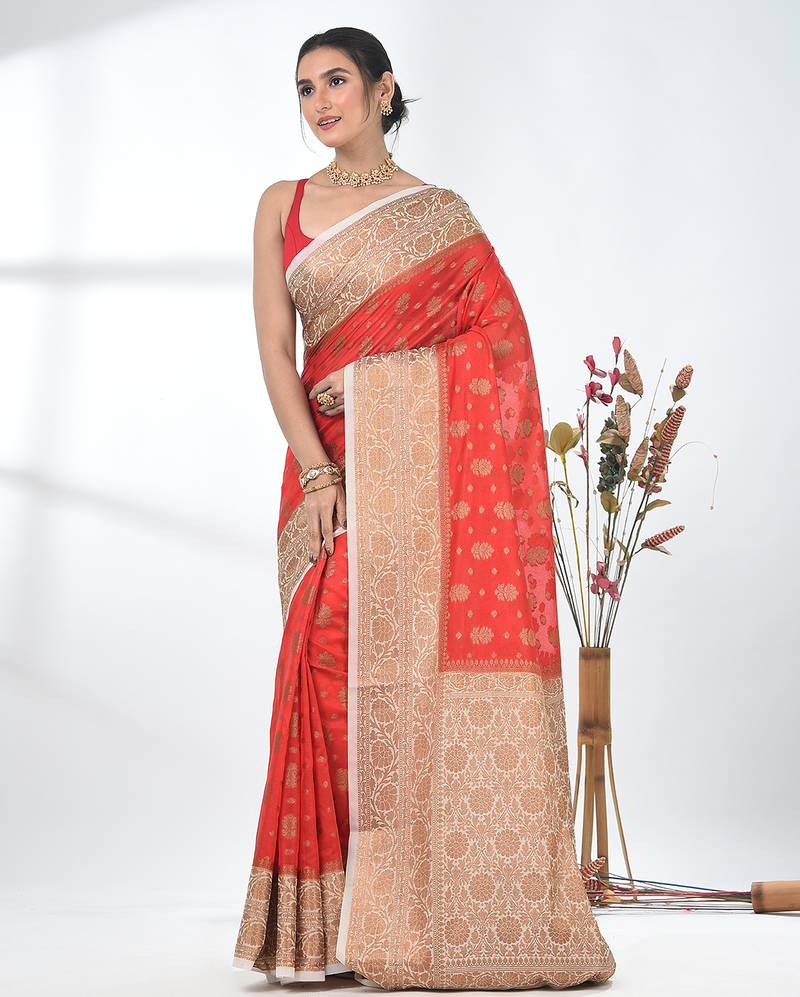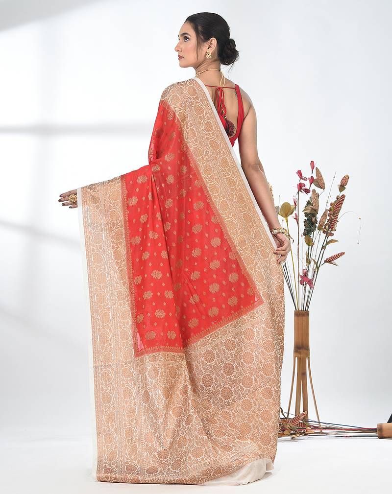 Red georgette saree with red and gold border