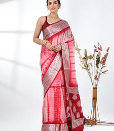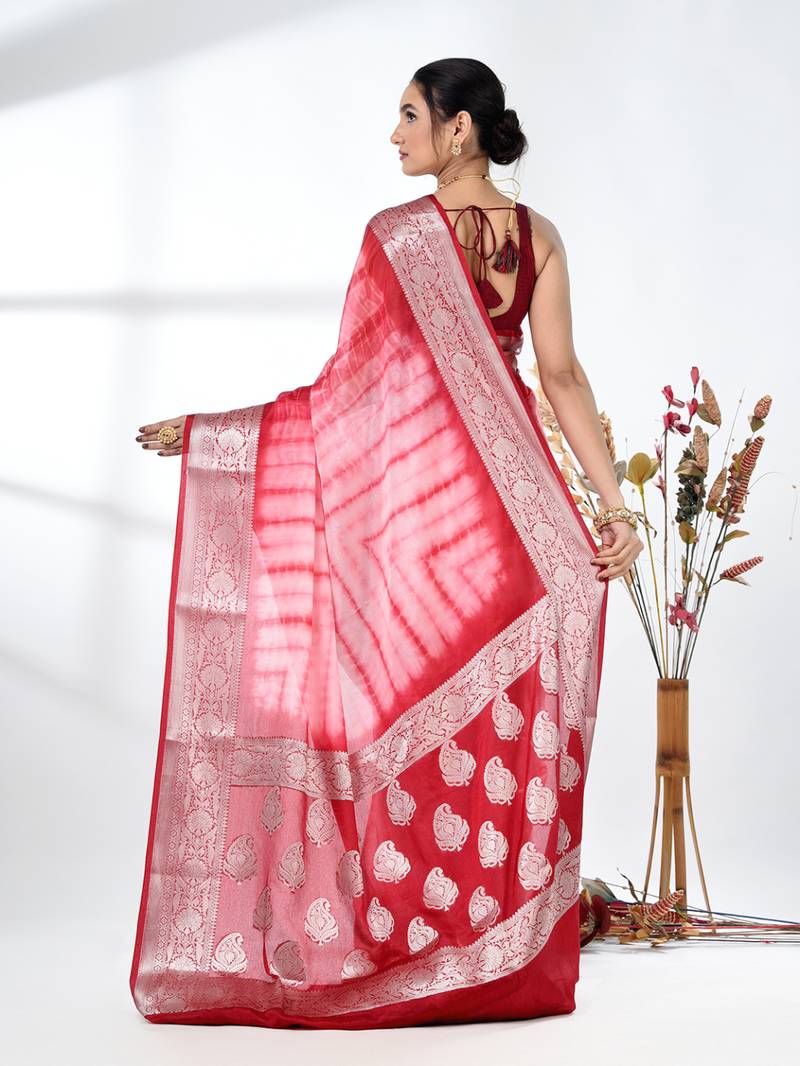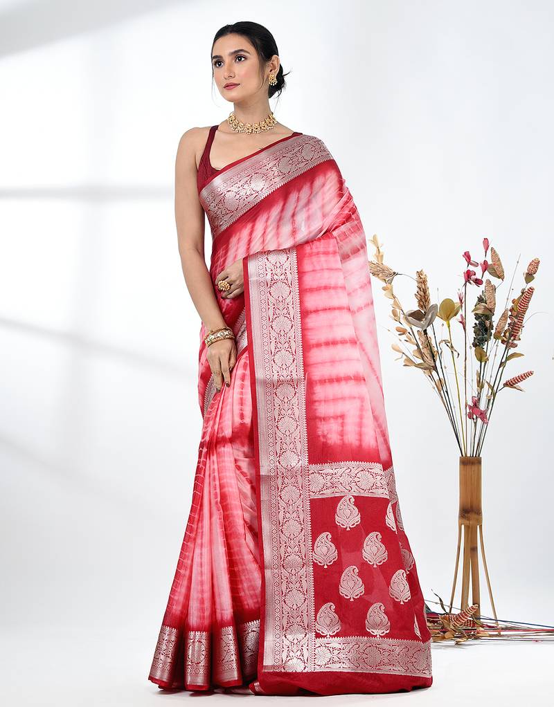 Red & white silk blend tie & dye saree with intricate border