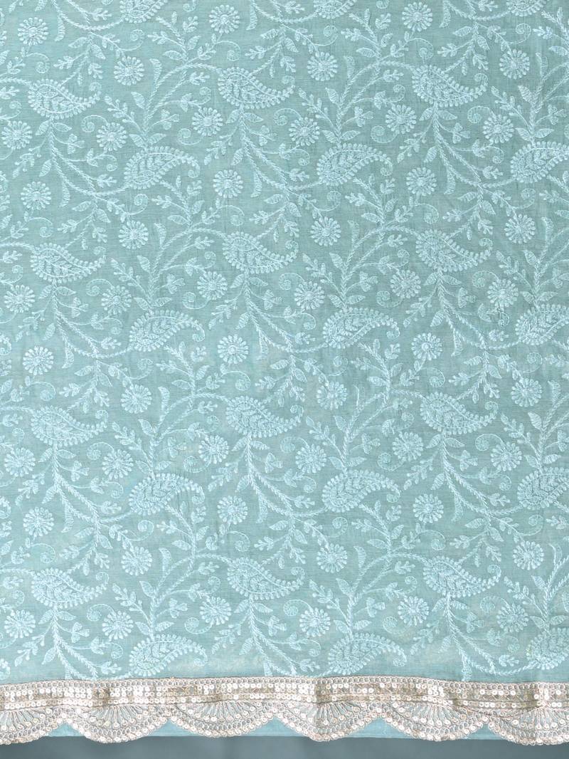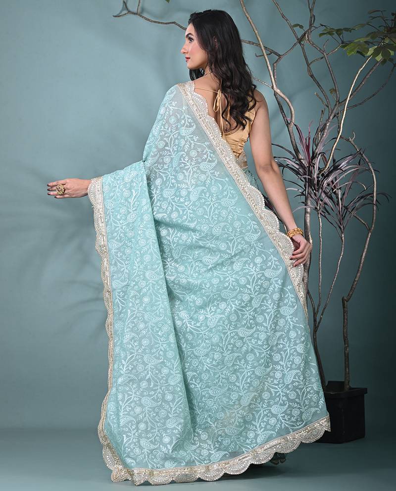Sea green chanderi silk blend saree with embroidered floral design