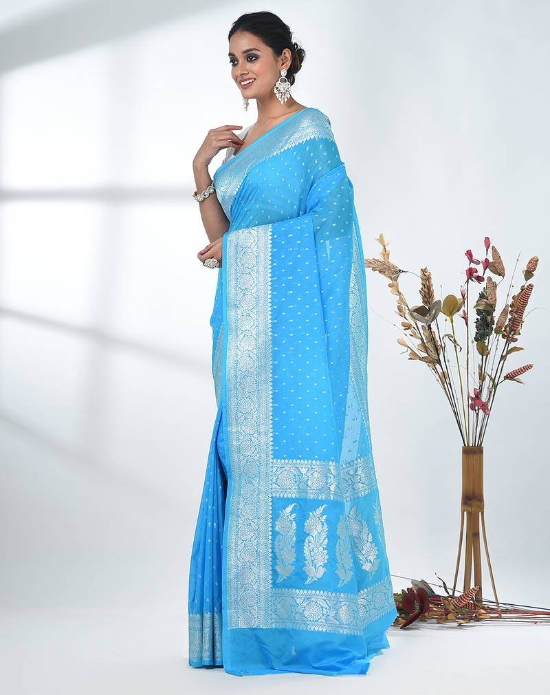 Sky blue georgette saree with silver border and detailing