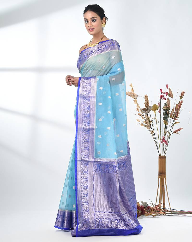 | Product Description | This Exquisite Saree Is Crafted From Premium Organza Fabric, Offering An Elegant And Lightweight Feel. The Rich Sky Blue Color Serves As A Stunning Backdrop For Delicate Floral Motifs, Intricately Woven Into The Fabric, Adding A Touch Of Sophistication. The Saree Is Bordered With A Contrasting Blue Shade, Beautifully Accentuating Its Refined Design. Its Soft Sheen Creates A Mesmerizing Visual Appeal, Making It Perfect For Special Occasions Such As Weddings, Festive Celebrations, Or Evening Events. |