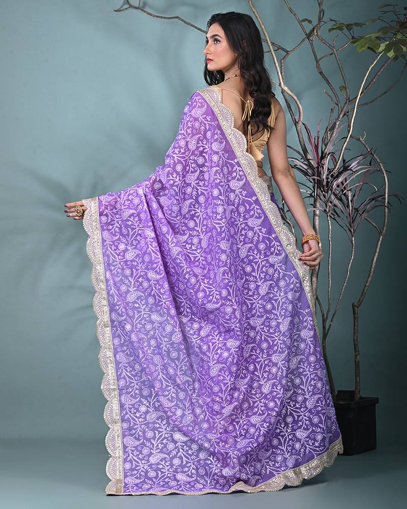 | Product Description | This Exquisite Violet Chanderi Silk Saree Features Delicate Floral Embroidery That Adds A Touch Of Traditional Charm. The Intricate Embroidery Is Beautifully Complemented By The Shimmering Texture Of The Chanderi Fabric, Making It Perfect For Weddings, Festivals, Or Any Grand Celebration. The Saree Is Further Enhanced With A Scalloped Border, Adding A Graceful And Elegant Finish. Pair It With Your Favorite Blouse To Create A Stunning Ensemble For Any Special Occasion. |