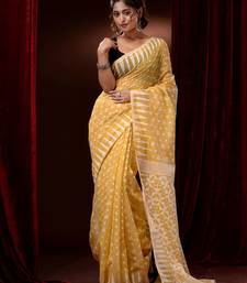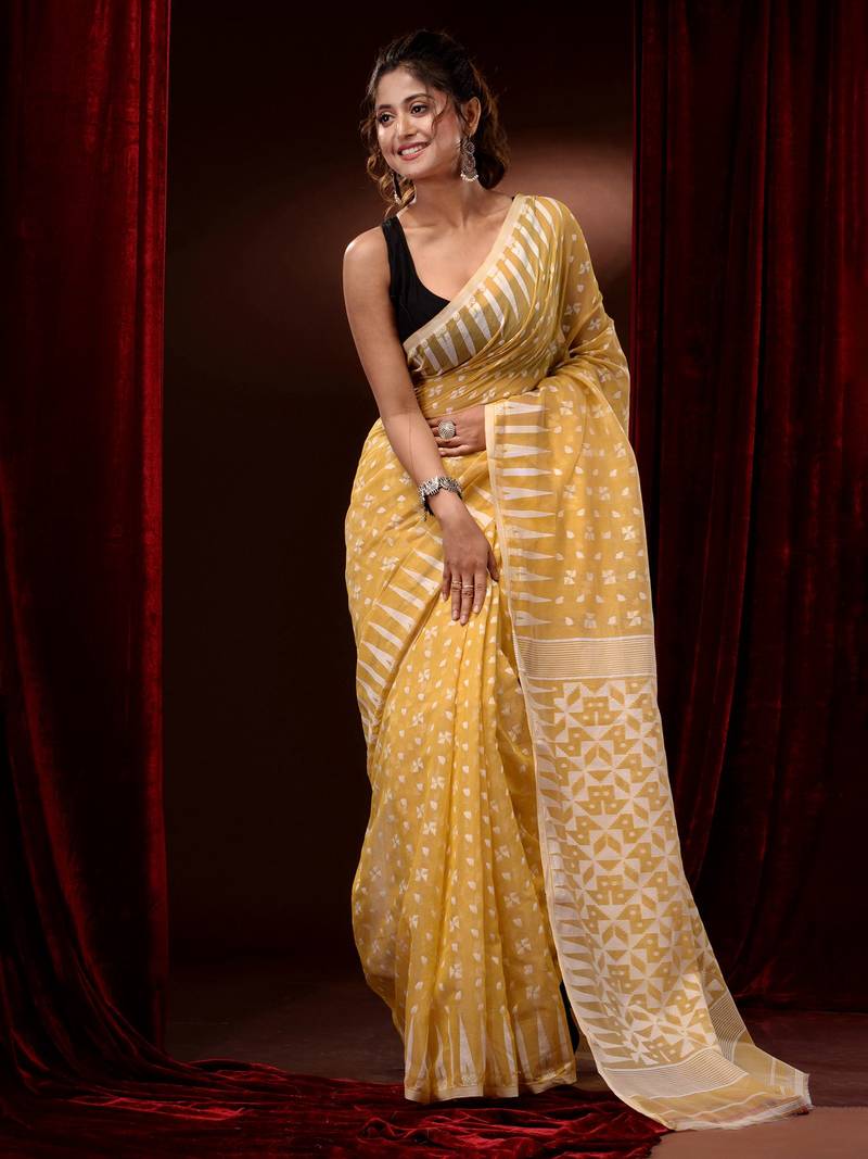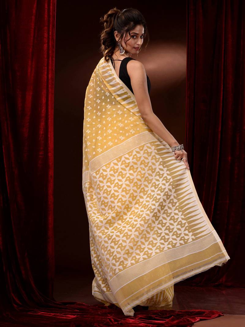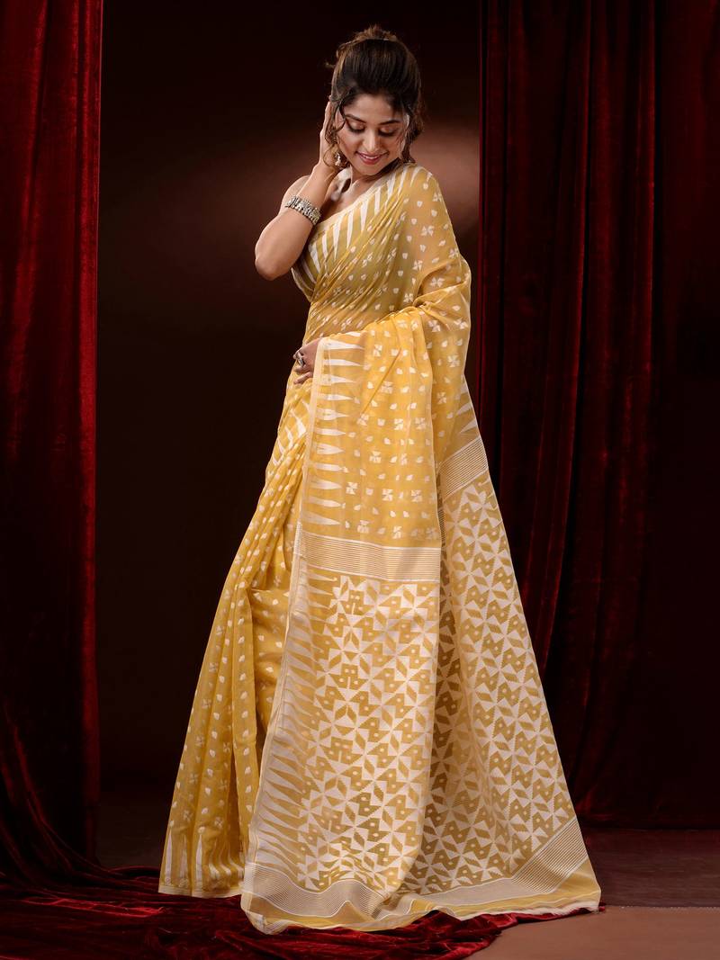 Yellow silk cotton handwoven jamdani saree with woven designs and motifs