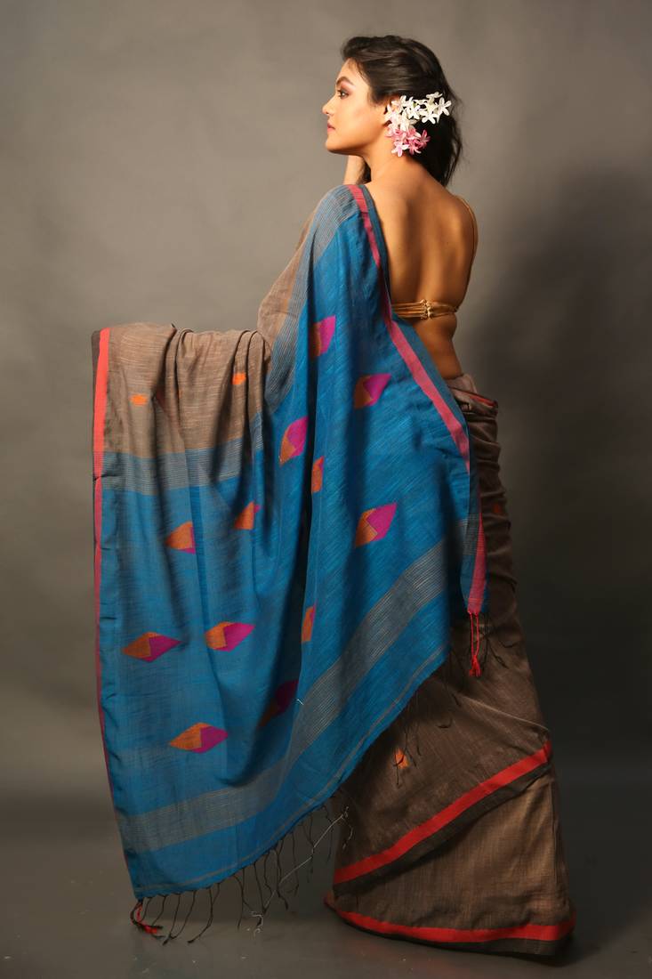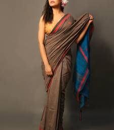 Dark brown woven blended cotton saree with blouse