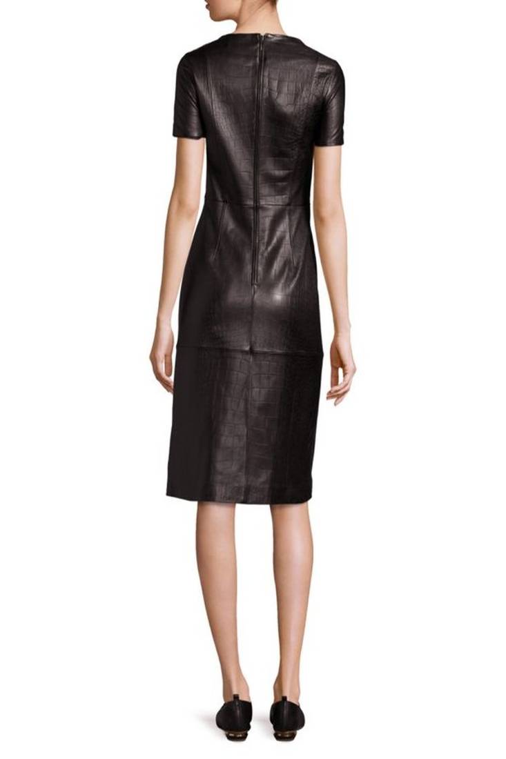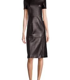 Women’s black lambskin leather crocodile textured real leather short sleeve midi dress