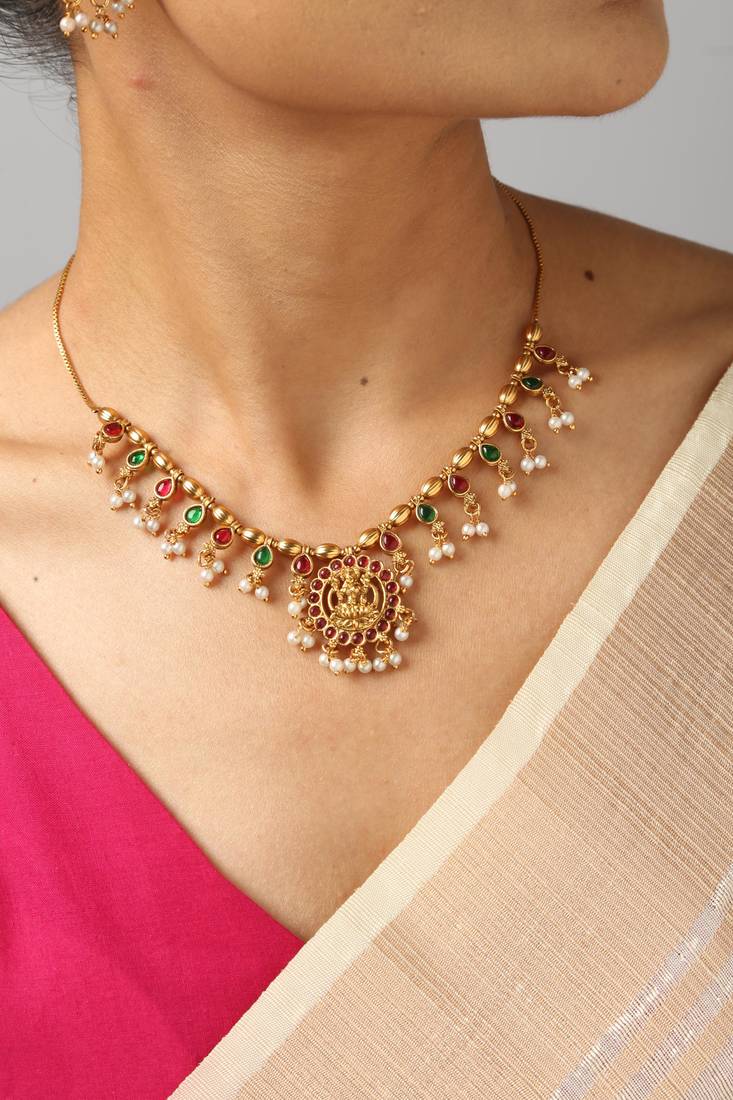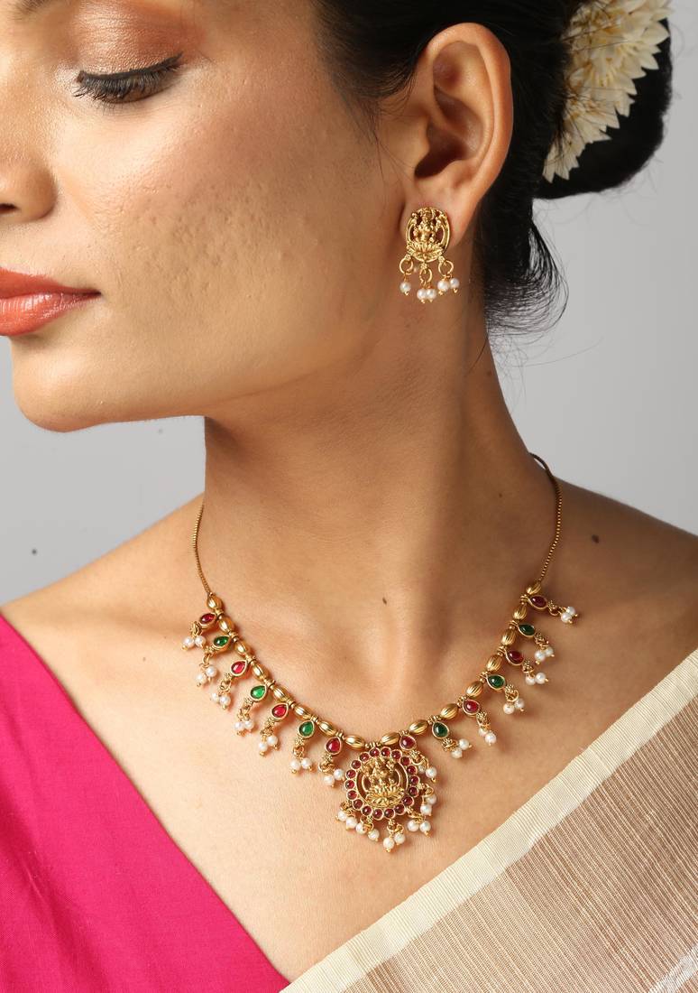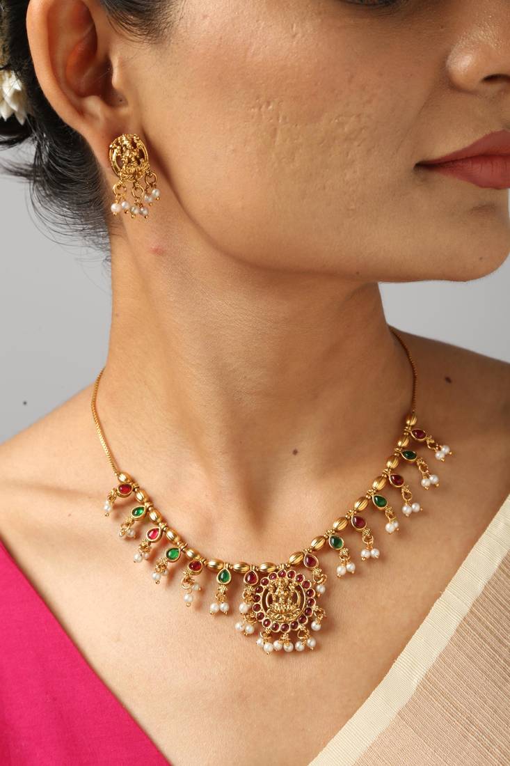 | Product Description | Grace Your Neckline With This Divine Antique Gold Plated Necklace. It Features A Central Circular Lakshmi Pendant Surrounded By Ruby Hued Stones, Connected To A Chain Adorned With Red And Green Teardrop Accents And Dangling Pearls. With Matching Deity Motif Stud Earrings, This Set Blends Spiritual Significance With Traditional Fashion For A Graceful Festive Appearance. |