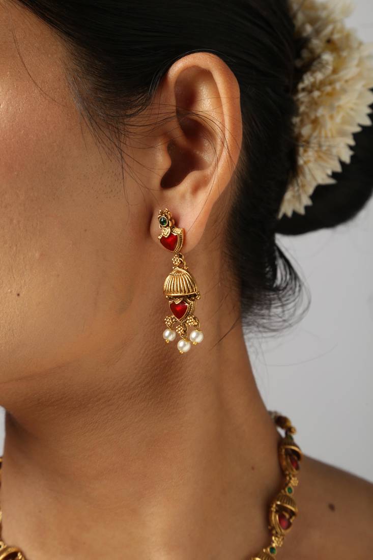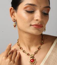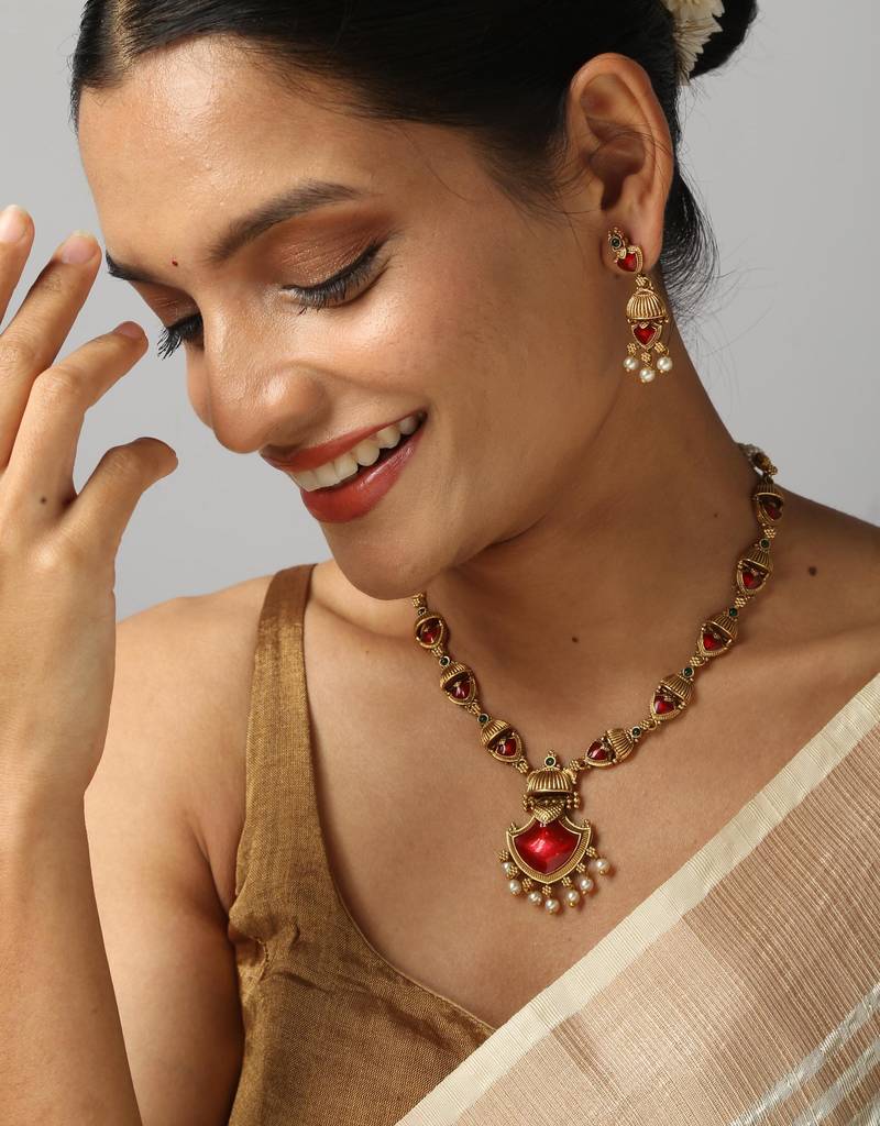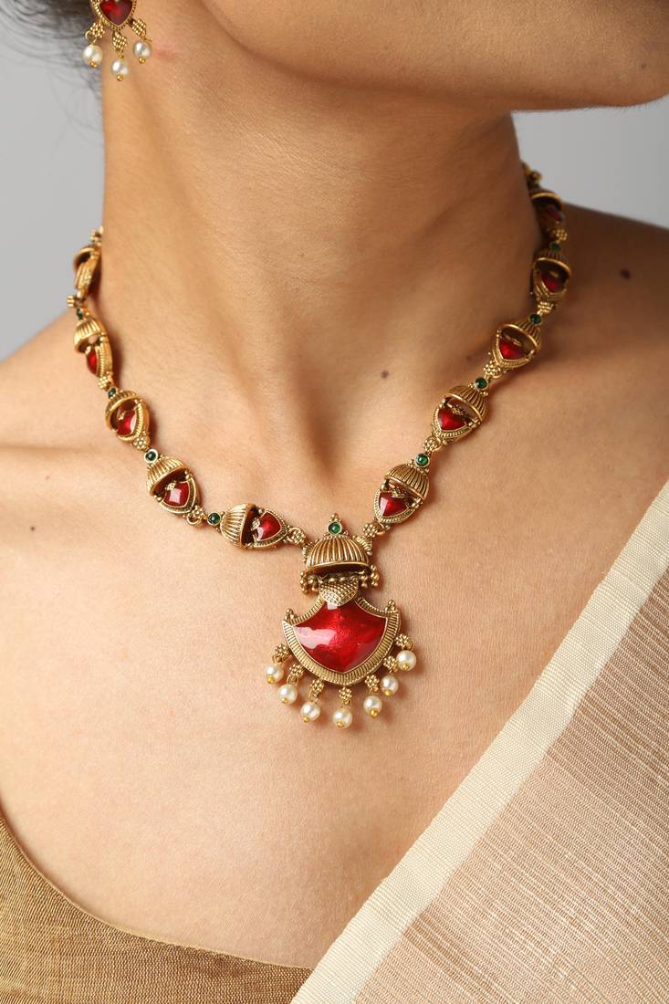 | Product Description | Radiate Timeless Beauty With This Antique Gold Plated Necklace Set, Featuring A Captivating Array. The Centerpiece Is A Stunning Geometric Pendant Bordered By Intricate Gold Detailing And Delicate Pearl Accents. Complete With Matching Drop Earrings, This Lightweight Set Is Perfect For Adding A Touch Of Regal Elegance To Sarees And Ethnic Ensembles. |