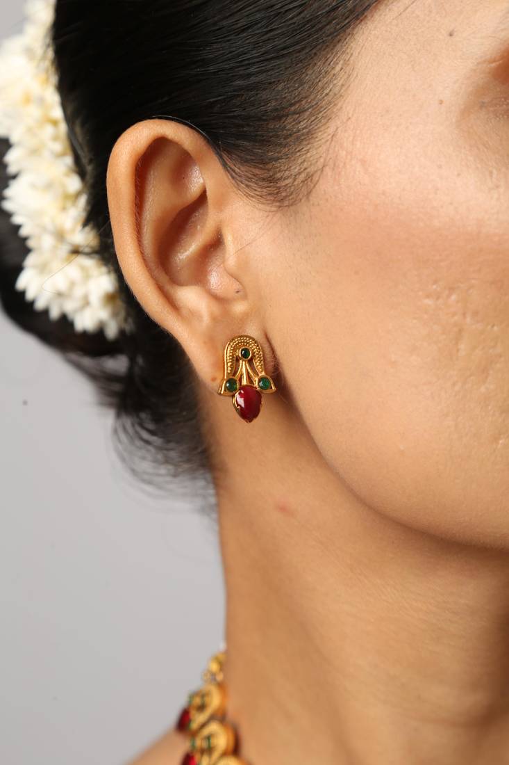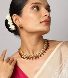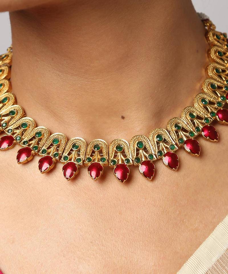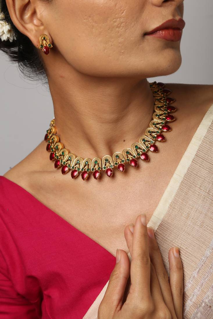 | Product Description | Elevate Your Traditional Wardrobe With This Exquisite Gold Plated Necklace Set. Featuring A Rhythmic Arrangement Ofred With Emerald Green Detailing, This Handcrafted Piece Radiates Timeless Elegance. The Matching Stud Earrings Complete The Look, Making It A Perfect Choice For Weddings, Festivals, And Festive Celebrations. |