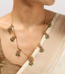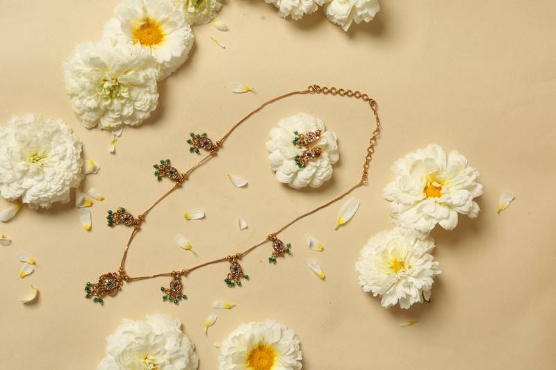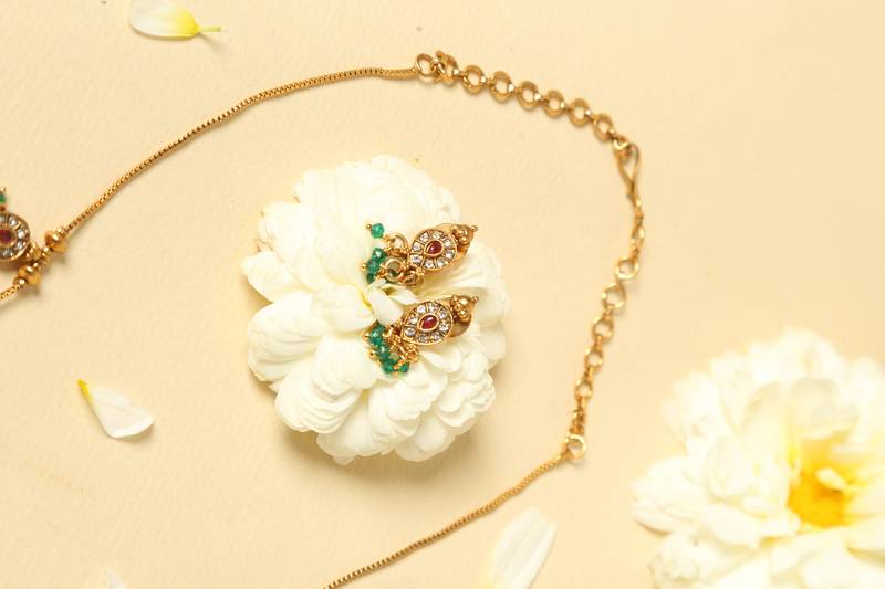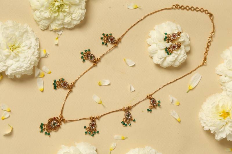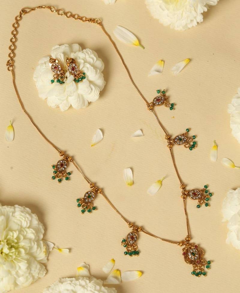 | Product Description | Embrace Subtle Elegance With This Delicate Gold Plated Chain Necklace. Adorned With Spaced Out Floral Charms Featuring Red And Green Stone Accents And Tiny Pearl Clusters, This Piece Offers A Refined, Minimalist Traditional Look. Including Matching Stud Earrings, It Is Perfect For Casual Ethnic Wear Or As A Thoughtful Gift For Loved Ones. |