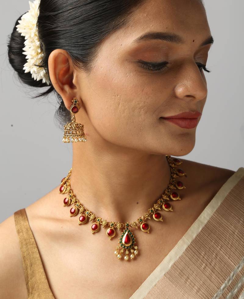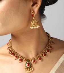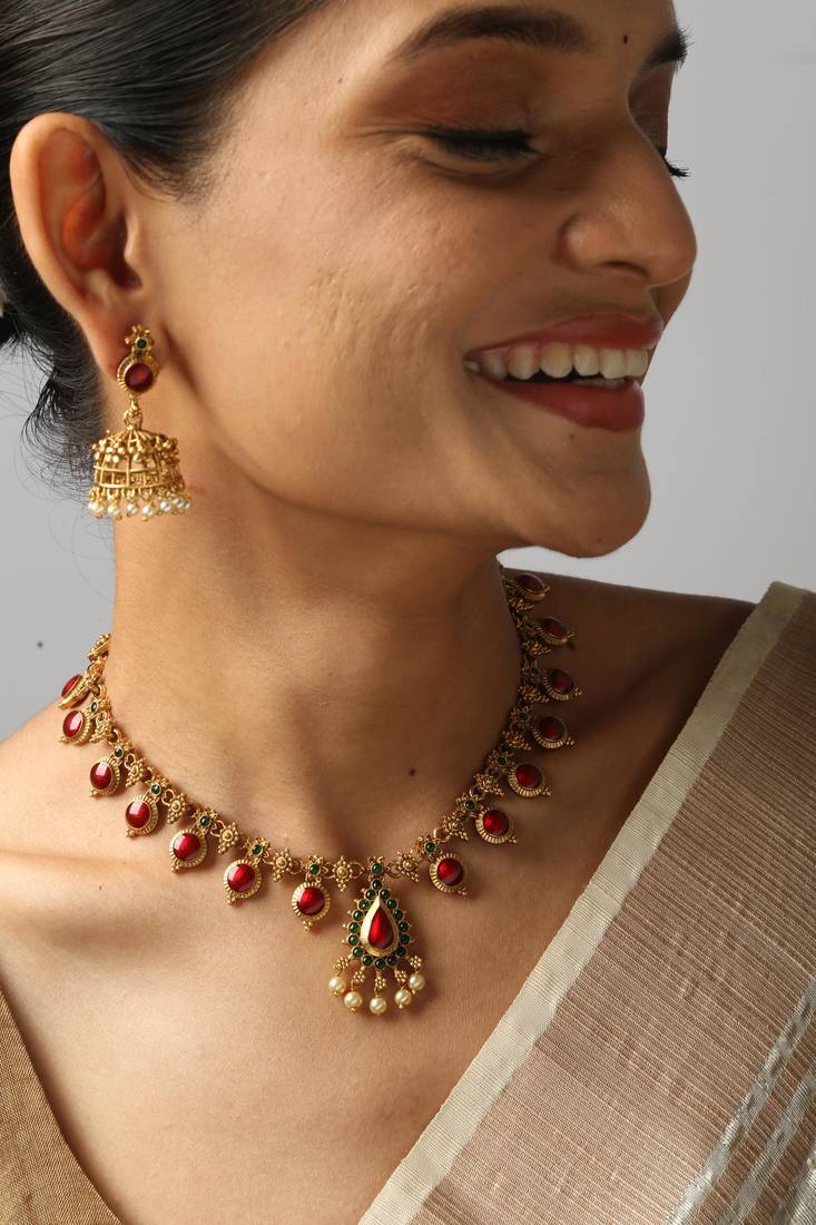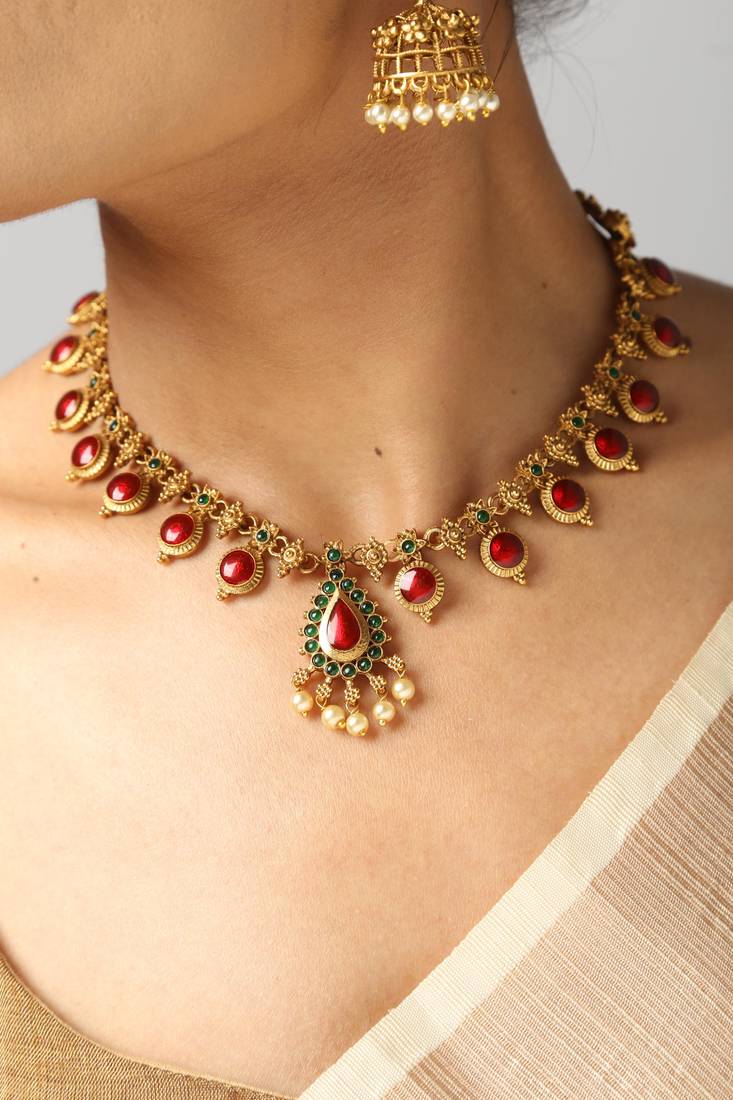 | Product Description | This Graceful Gold Tone Necklace Features Oval Red Detailing Bordered With Fine Detailing And A Matching Earring Pair. Designed For Festive And Traditional Wear, It Delivers Vibrant Color And Refined Elegance. A Perfect Choice For Weddings, Celebrations, And Cultural Gatherings. |