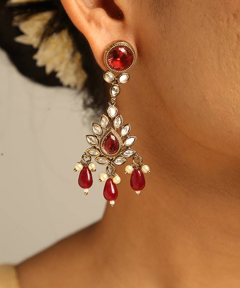 | Product Description | Exude Vintage Charm With This Antique Finished Kundan Choker. Adorned With Deep Ruby Accents And Delicate Pearl Droplets, The Ornate Centerpiece Reflects Royal Heritage. The Matching Heavy Jhumka Style Earrings Add Dramatic Flair, Ensuring You Stand Out At Weddings. A Masterful Choice For Pairing With Rich Silk Sarees Or Lehengas. |