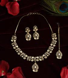 | Product Description | Elevate Your Style With This Unique Pendant Style Necklace Set, Blending Modern Baguettes With Traditional Polki Stones. The Intricate Crescent Motifs And Geometric Crystal Borders Offer A Refined, Artistic Aesthetic. Complete With A Matching Maang Tikka And Earrings, This Lightweight Gold Finished Set Provides High Impact Glamour For Every Festive Occasion. |
