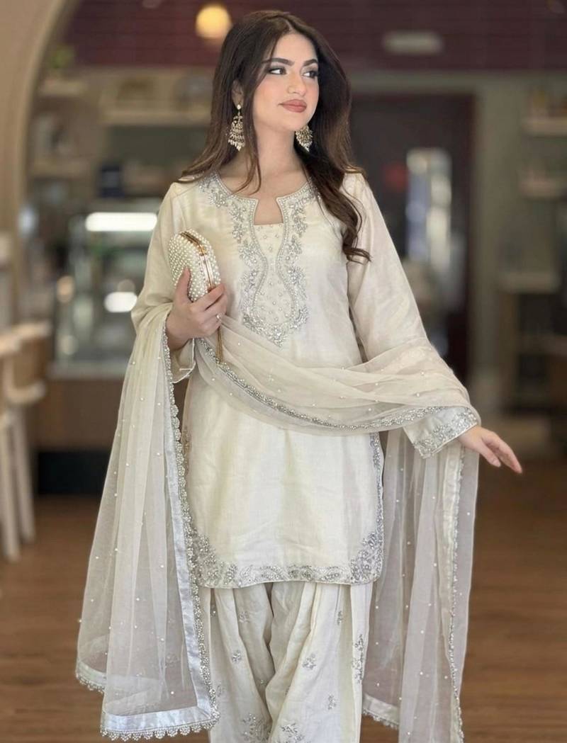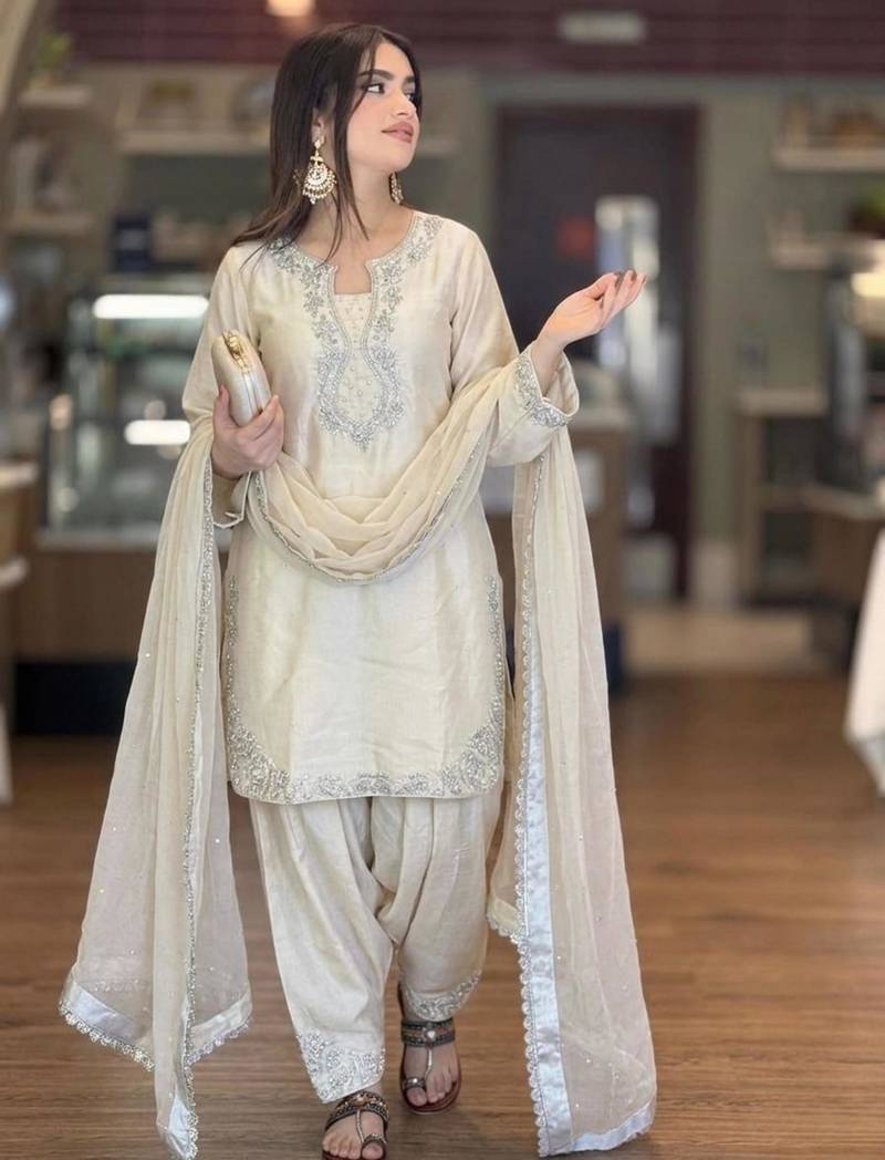 Beige silk blend embroidered farshi slawr kameez set stitched