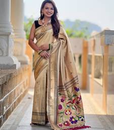 Celebrate Heritage With This Elegant Beige Tussar Silk Saree. The Neutral Base Is Elevated By Colorful, Woven Floral And Bird Motifs On The Pallu, Reflecting Authentic Indian Craftsmanship. Paired With A Sleek Black Sleeveless Blouse, This Saree Offers A Sophisticated, Understated Look Suitable For Professional Events And Cultural Functions.