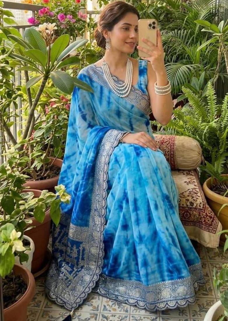 | Product Description | Discover Ethereal Beauty With This Vibrant Azure Blue And White Shibori Tie Dye Saree. Elegantly Finished With A Delicate Scalloped Silver Embroidered Border, This Refreshing Drape Offers A Breathtaking Fusion Of Contemporary Aesthetics And Traditional Charm. Experience Unparalleled Comfort And Fluid Movement, Making It Ideal For Daytime Celebrations And Elegant Soirées. |