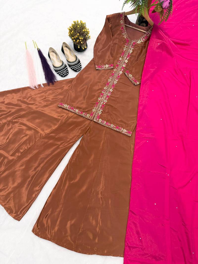 | Product Name | Brown Anarkali Suit With Hot Pink Dupatta Threadwork | |