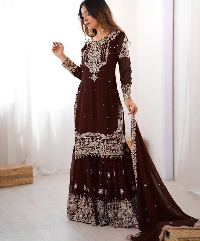 Brown faux georgette embroidered sharara set stitched
