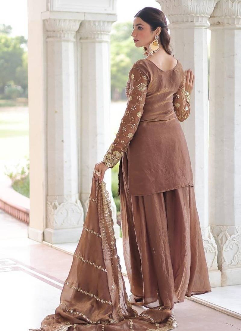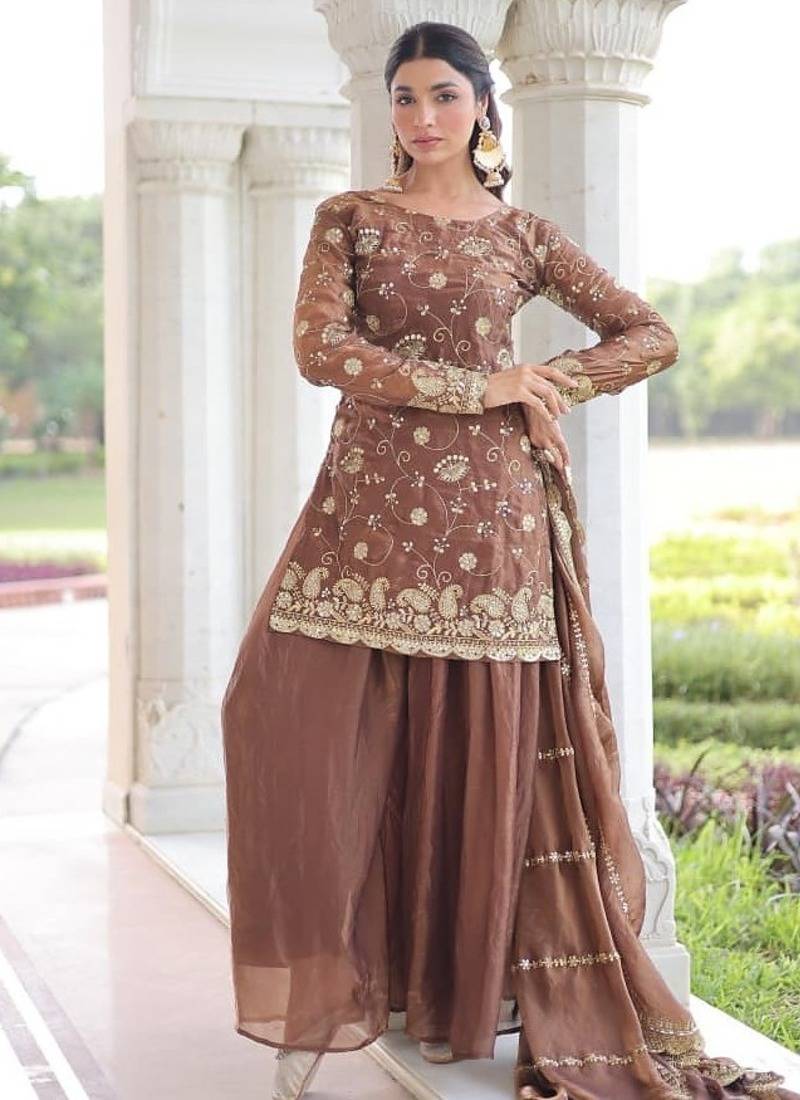 | Product Description | Embrace Earthy Tones With This Espresso Brown Silk Blend Suit. The Kurta Is Meticulously Detailed With Floral Sequins And Golden Threadwork, Paired With Flowing Parallel Trousers. Finished With A Matching Dupatta Featuring Ornate Scalloped Borders, This Set Combines Traditional Craftsmanship With A Refined, High Fashion Appeal For Any Special Occasion. |