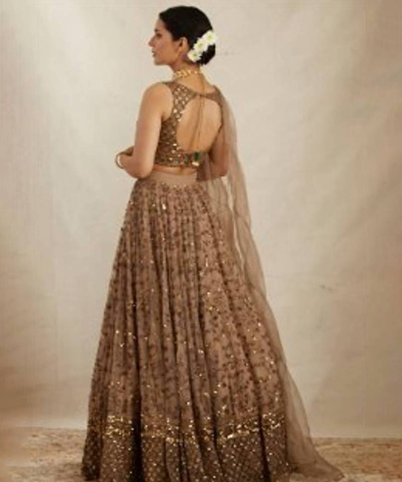 Brown net zari sequin embroidery work lehenga choli with dupatta