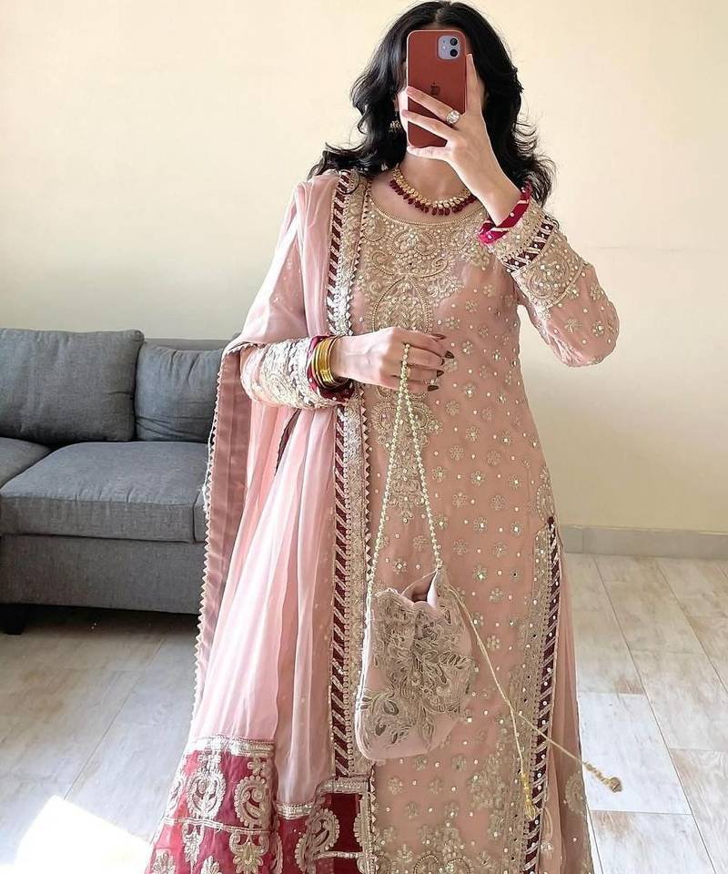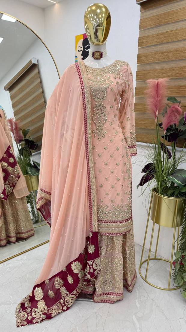 | • | Kameez | : | Color- Light Peach / Fabric- Faux Georgette |