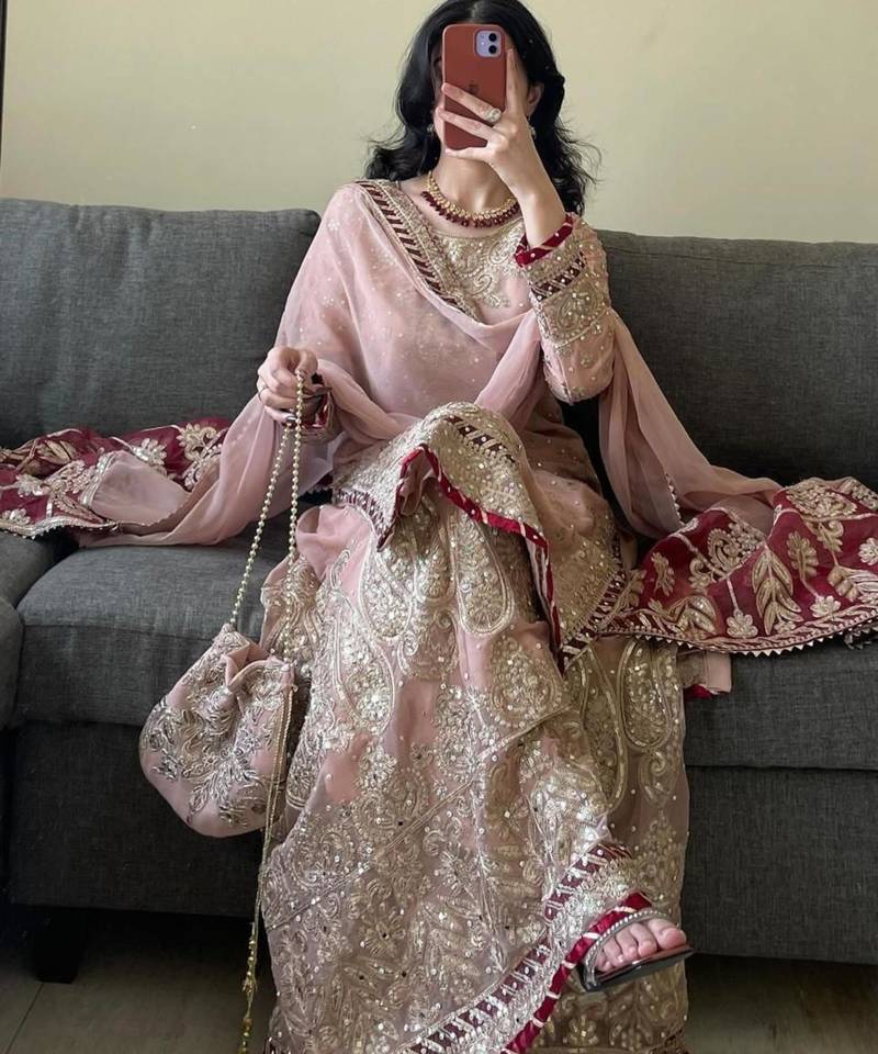 | Product Name | Charming Light Peach Silk Suit With Intricate Floral Embroidery | |