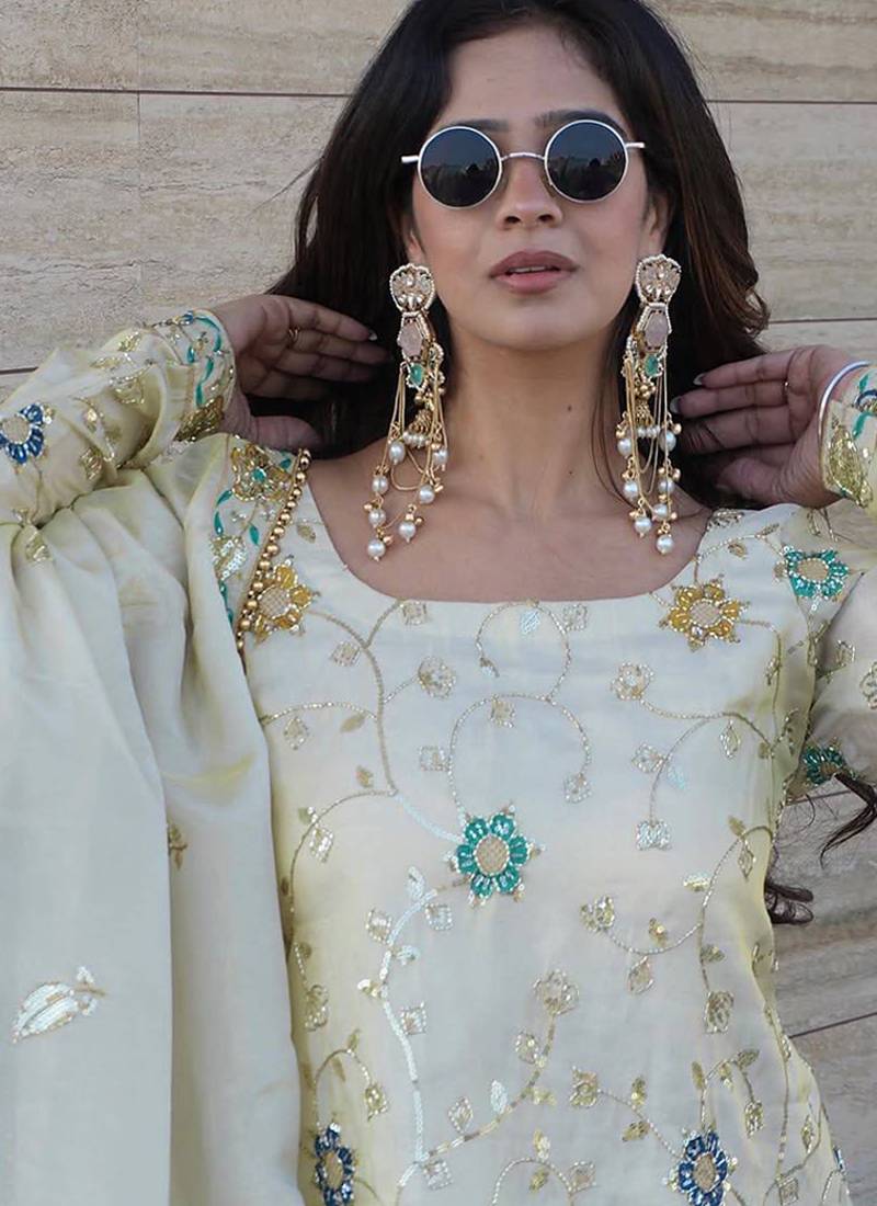 Chinon silk cream floral sharara set stitched