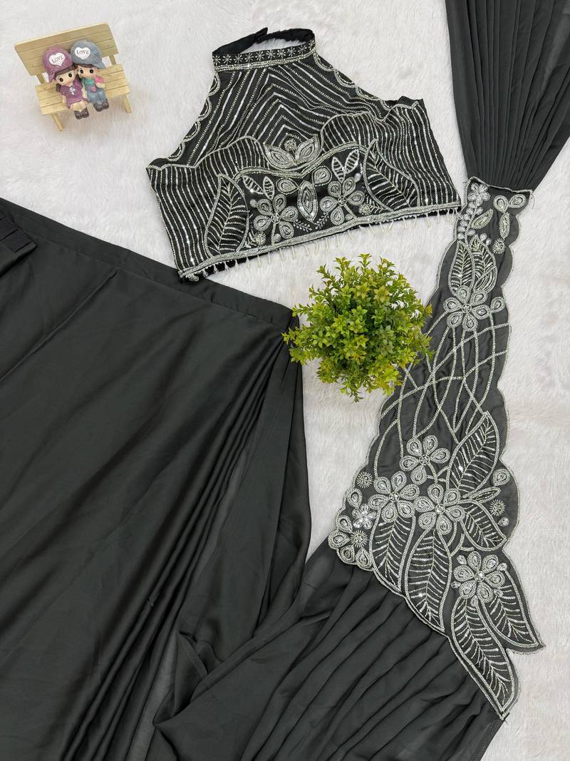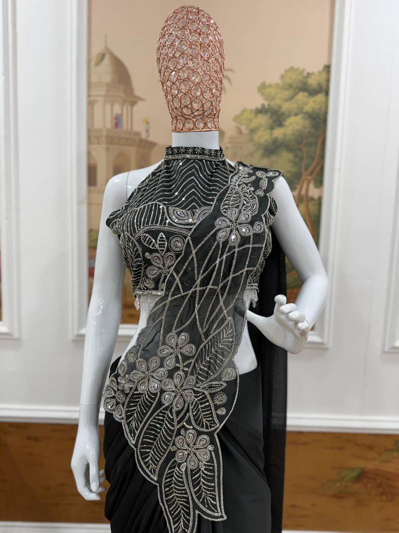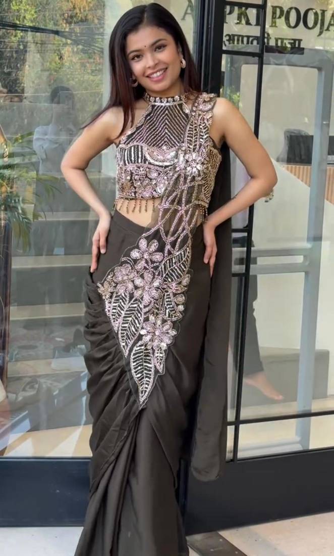 | Product Description | Sophistication Meets Chocolate Saree. The High Fashion Halter Bodice Is Adorned With Vertical Silver Beadwork And Oversized Floral Appliqués That Trail Down The Waist. This Pre Draped Silk Blend Garment Offers A Sharp, Modern Silhouette, Perfect For Fashion Forward Individuals Attending Exclusive Evening Soirées Or Luxury Events. |