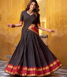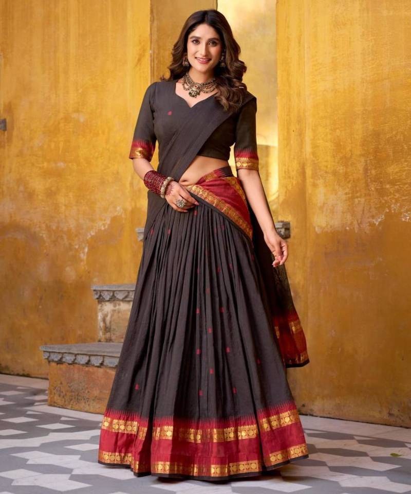 | Product Description | Experience Timeless Elegance In This Dark Chocolate Silk Blend Lehenga. The Set Features A Rich, Pleated Skirt Accented By A Traditional Crimson And Gold Zari Border. Paired With A Matching Gray Blouse And A Vibrant Red Dupatta, This Cultural Masterpiece Is Perfect For Religious Festivals And Heritage Wedding Celebrations. |