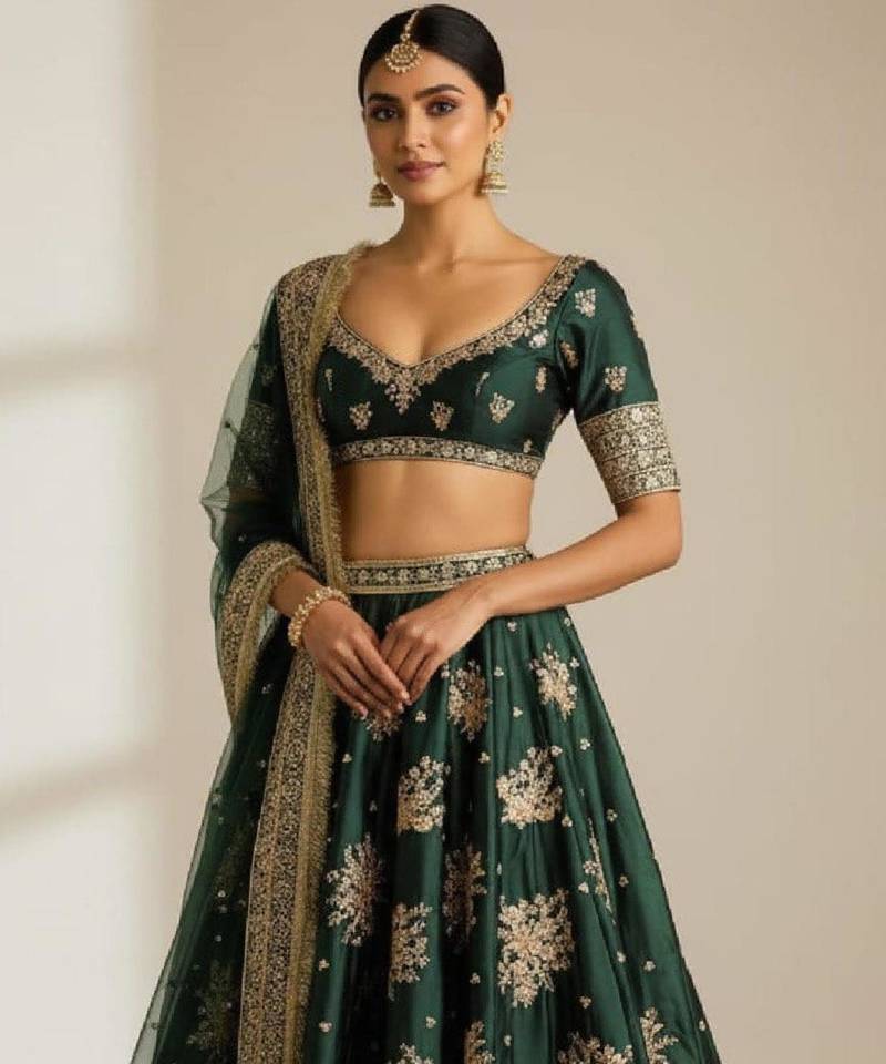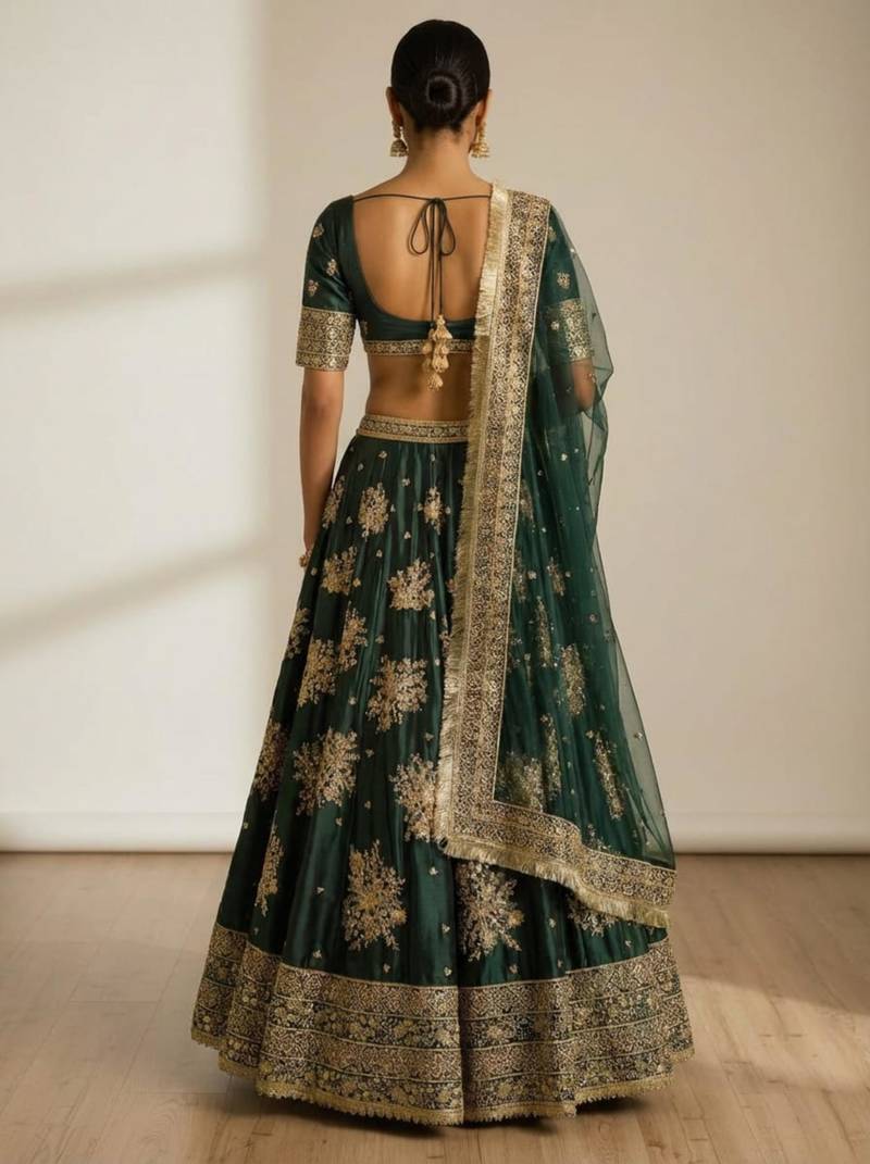 | Product Description | Embody Tradition With This Luxurious Dark Green Lehenga. Made From Fine Silk, The Outfit Features Classic Golden Zari Motifs And A Beautifully Bordered Dupatta. The Deep Jewel Tone Combined With Structured Embroidery Offers A Majestic Look, Making It A Standout Choice For Traditional Ceremonies And Winter Weddings. |