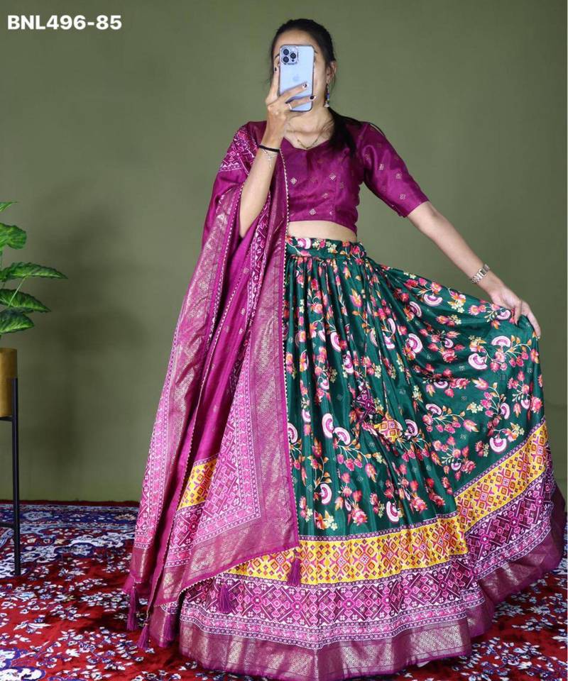 | Product Description | Captivate In This Dark Green Silk Blend Printed Lehenga. The Deep Green Circular Skirt Is Adorned With Elegant Floral Prints, Perfectly Complemented By A Magenta Printed Choli And Matching Dupatta. This High Quality, Semi Stitched Ensemble Provides A Rich Color Palette And Comfortable Fit, Ensuring A Standout Look At Any Traditional Celebration. |