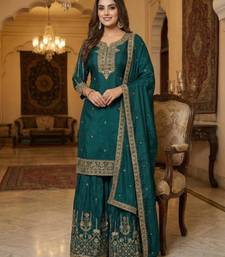 Dark teal silk embroidered sharara set stitched