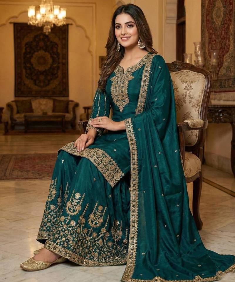 | Product Name | Dark Teal Silk Embroidered Sharara Set | |