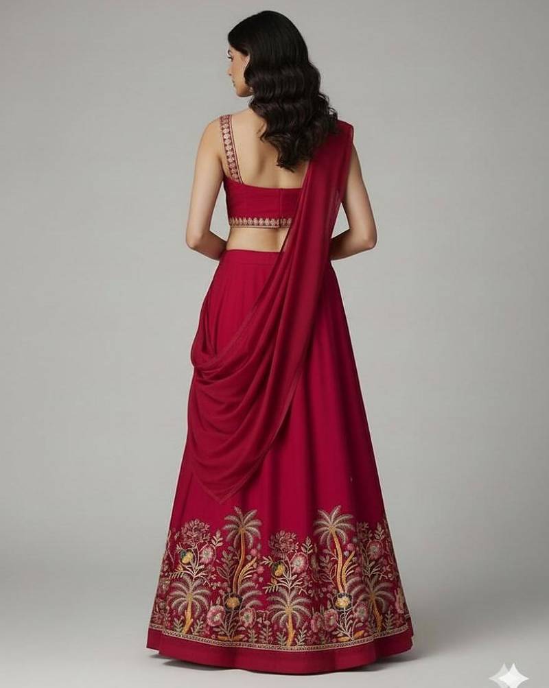 | Product Description | This Deep Red Lehenga Set Features A Sleeveless Blouse, Flowing Skirt, And Draped Dupatta With Intricate Gold Floral Embroidery Along The Hem. Made For Comfort And Style, It Creates A Rich Festive Look. Ideal For Weddings, Traditional Ceremonies, And Grand Celebrations. |