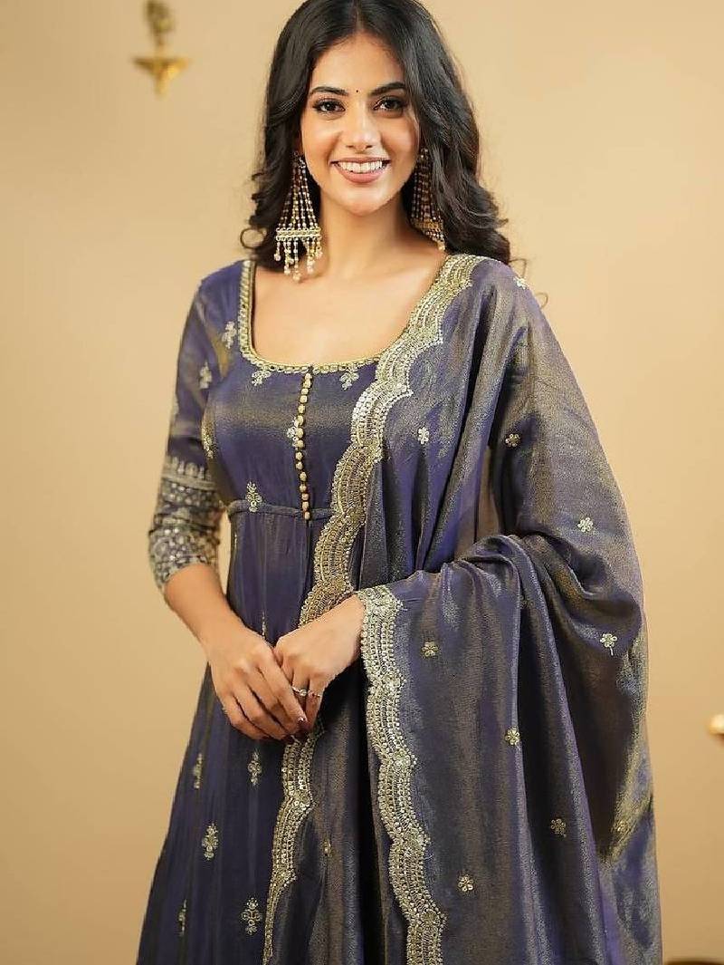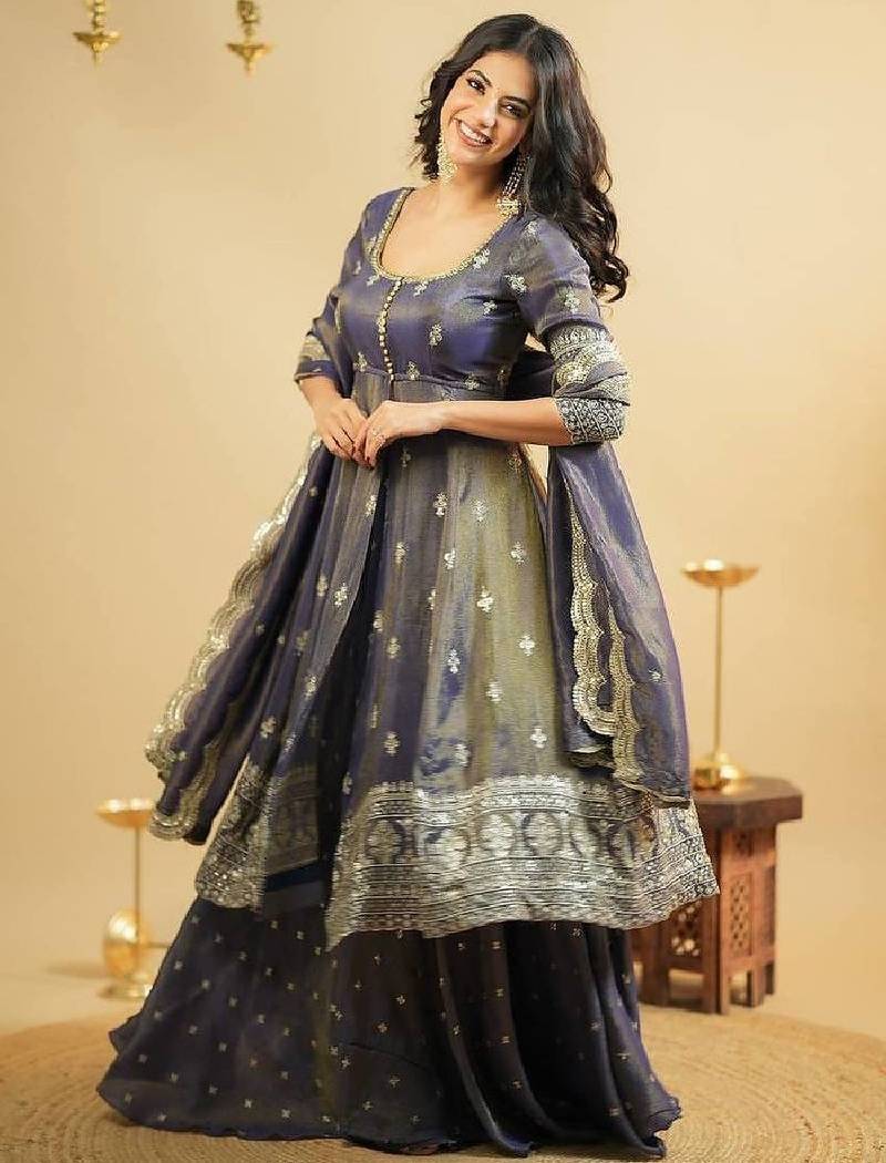 | Product Description | Radiate Vintage Charm In This Unique Dusky Lavender Palazzo Set. The Shimmering Metallic Finish Is Complemented By Detailed Gold Borders And Floral Motifs. This Ensemble Features A Flattering Mid Length Kurta Paired With Wide Leg Palazzo Pants And A Scalloped Dupatta, Perfect For Those Seeking A Distinguished Look For Festive Occasions. |