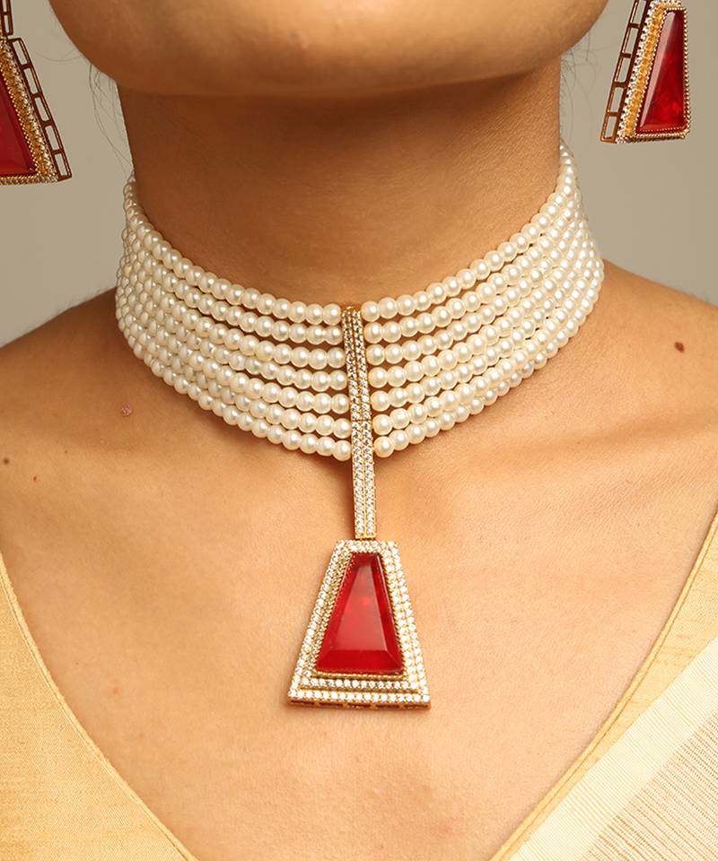 | Product Description | Make A Bold Architectural Statement With This Unique Geometric Jewelry Set. Five Rows Of Luminous Pearls Support A Vibrant, Triangular Ruby Pendant Edged In Fine Crystals. This Contemporary Take On Heritage Jewelry Is Perfect For Modern Bridesmaids Seeking A Fusion Of Sharp, Modern Lines And Classic Indian Elegance. |