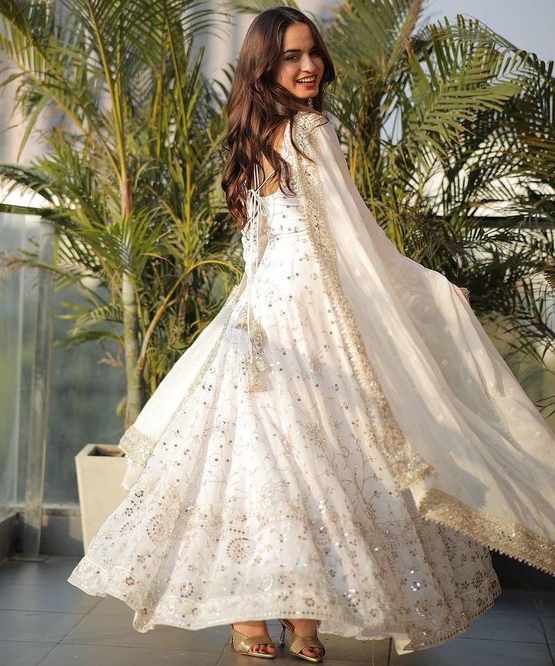 Georgette white embroidered anarkali set stitched